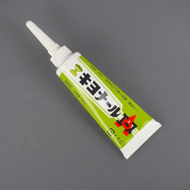 | 使用方法 | 1,キャップを外し、トンガリノズルの先を切ります。この時、個人のお好みで水平に切ったり、斜めに切ったり、本剤が出やすいように根元に近い位置で切ってください。 2,剪定痕や傷口の回りの部分を鋭利な小刀やナイフで綺麗に削ぎ落とします(その方が傷口の治癒が早くなります)。 3,散水直後の塗布は避け、傷口の回りの部分(形成層、ここから傷が治癒してきます)を覆うように傷全体に塗布します(塗布の厚さは0.5mm程度を推奨。厚すぎると垂れ落ちてくる可能性があります)。 4,乾燥するまで散水は避けてください(理想的には半日以上。天候によりますが最低でも1、2時間程度は空けてください)。 5,治癒が進みカルスが形成され周りが盛り上がってくると、その部分から本剤がひび割れてくることがあります。その場合は適宜キヨナールエースを塗り直してください。 |