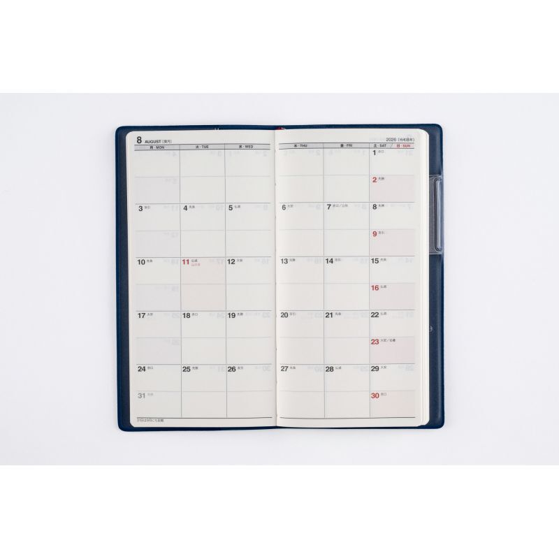 定番のビジネス手帳も、少しだけカジュアルに。ビジネスシーンにも馴染むシックな色のカバー。多くのビジネスパーソンに愛されたベーシックな記入形式が人気。月間ページはブロック式です。