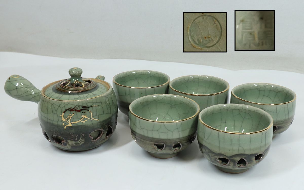 相馬焼 茶器揃 横手急須(春山) 湯呑(菅原) 5客 馬絵 走り駒 透かし 使用感の少ない美品です。 サイズ(約):