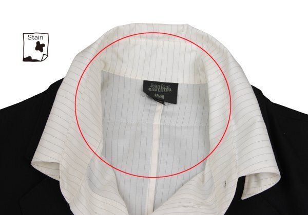 コンディション | 襟裏・袖裏にシミ、左脇下に小穴があります(写真参照)。 その他目立ったシミ、汚れ、ほつれ等なくいい状態です。クリーニング済み。 |