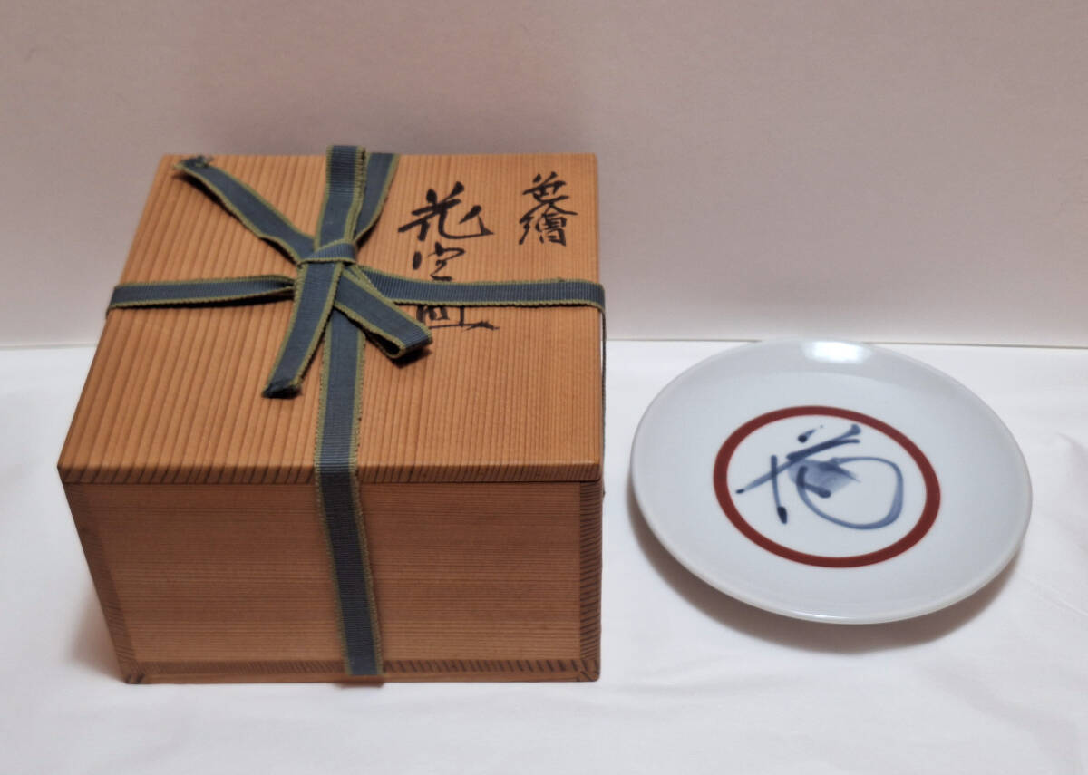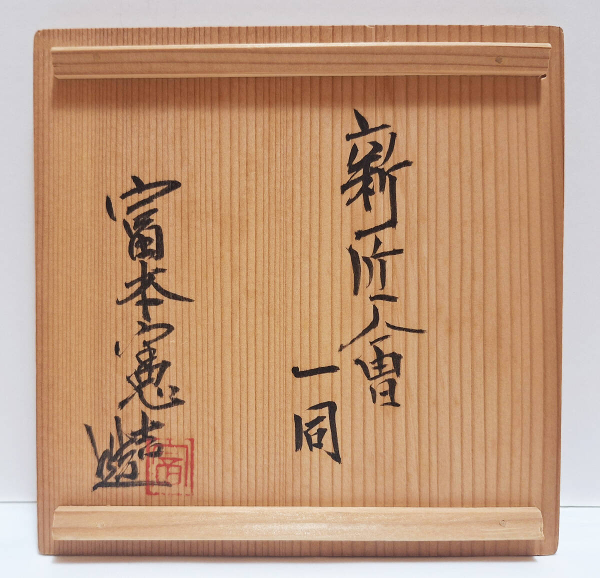 1947年(昭和22年)に設立された新匠美術工芸会(新匠会)の記念品であることが箱書から分かります。憲吉直筆の熨斗も付属しています。逆三角の口のサインから1948年(昭和23年)の製作と思われます。