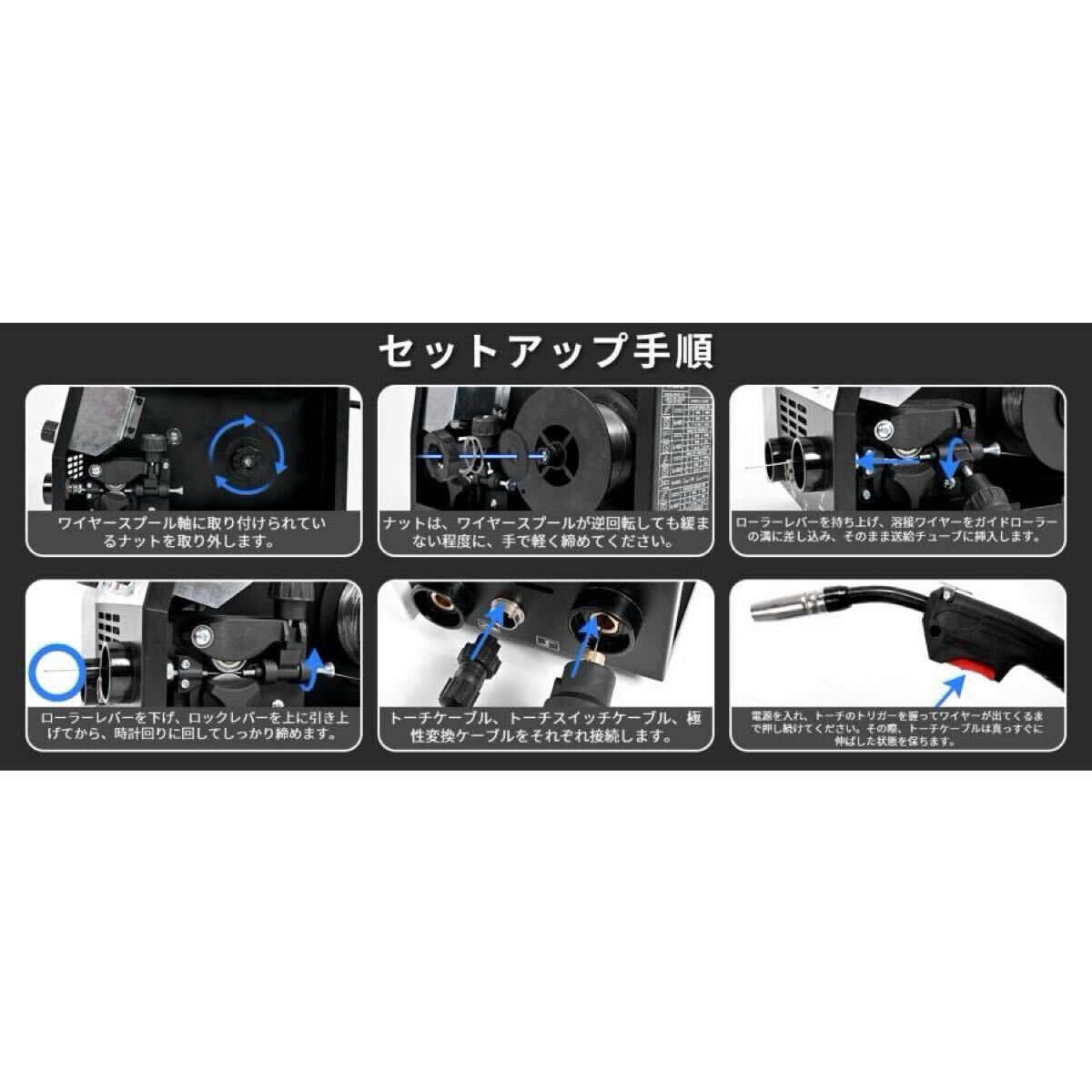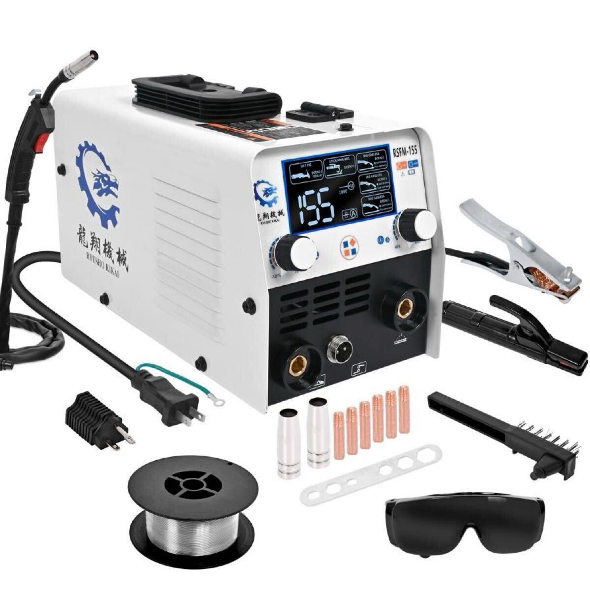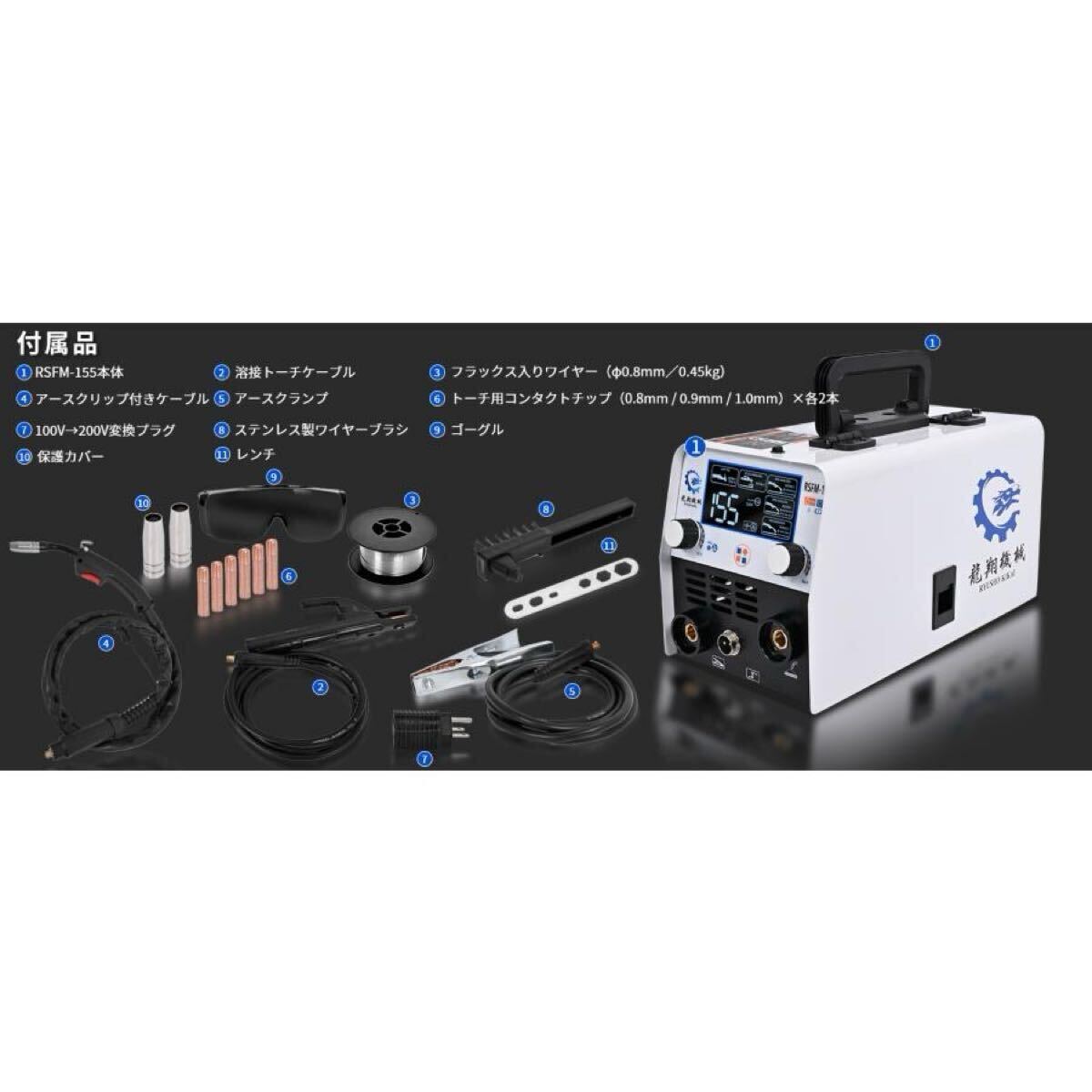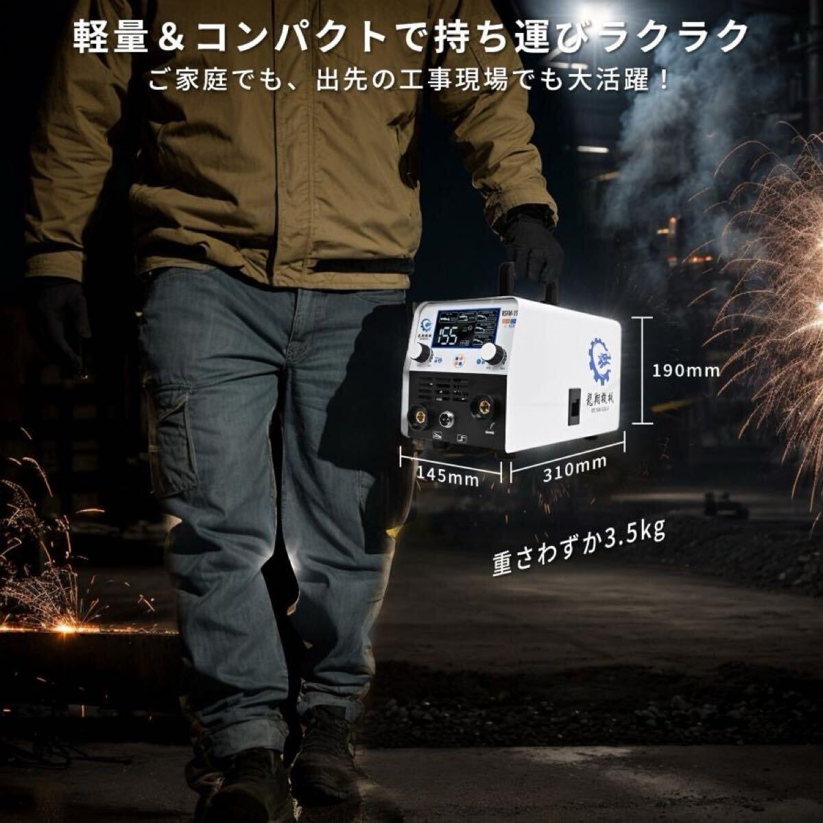 本体は小型で軽量(寸法約 31cm×14.5cm×19cm、重量 3.5kg)、持ち手を付属し、持ち運びが容易です。標準付属品には:溶接トーチ、接地クランプ、MIG 溶接ガン、0.8mm/0.45kg フラックス入りワイヤー、導電ノズル、保護ノズル、スチールブラシ、保護メガネ、電源コンバーター、レンチが含まれます