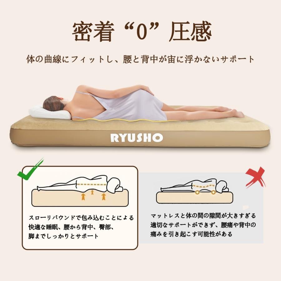 【快適なサポートと睡眠】:インフレータブルベッドで地面から25cmの高さ衝撃を吸収する設計で多点サポートによる圧力分散を実現。体の曲線にフィットし、スローリバウンド機能により、体を優しく包み込み、静かな睡眠環境を提供し、アウトドアでの体験をより快適にします。