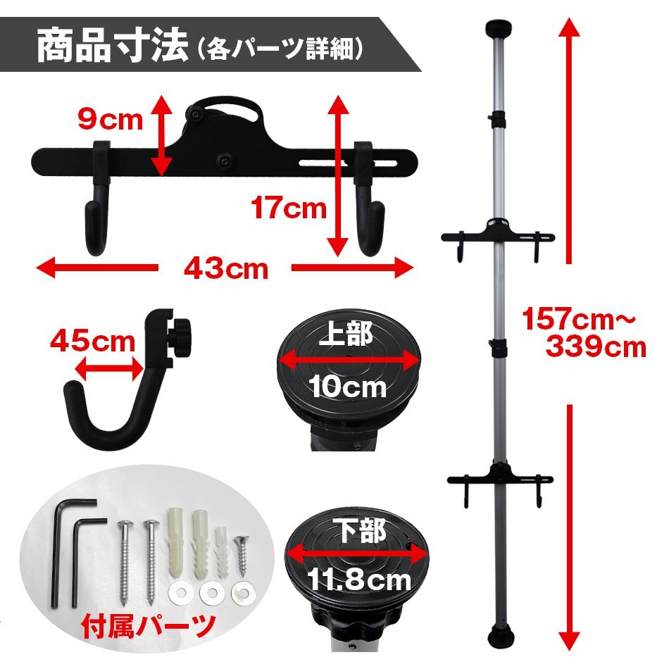 タワー型自転車スタンド!! 天井ツッパリ式で、天井高さ157cmから339cmまで設置可能、本体をしっかり支えます。 上段フックと下段フックの高さや幅、角度を自由に調整できます。 取付け、取外しも簡単です。 自転車を室内で保管するようになりますので、盗難などの心配や雨、風にさらされることなく、大切な自転車をしっかり守ります♪ 【商品仕様】 ・サイズ(約):幅430mm×高さ1570~3390mm×奥行き195mm(フック取り付け済み) ・重量(約):ポール 3.6kg / 自転車フック部 各0.7kg ・耐荷重:25kg ・カラー:シルバー ・設置可能・天井高:1570~3390mm ・素材:アルミニウム ・搭載可能自転車:20kg以下の自転車 【商品内容】 ・ポール(フック取り付け部ネジ×4) ・ポール上部フタ ・自転車フック部 ×2 ・六角レンチ(大) ・六角レンチ(小) ・床固定ネジ ×3 【取り付け方】 ・1.ポール上部のバネの上にフタを置きます。 ・2.2つのレバーを緩めます。 ・3.1段目ポールを伸ばし、レバーを締めます。 ・4.2段目ポールも天井まで伸ばし、レバーを締めます。 ・5.1段目ポールと2段目ポールのネジを締めます。 ・6.下部のダイヤルを左に回しテンションをかけます。 ・7.しっかり固定されているか確認をしてください。 ・8.フック部を組み立てます。 ・9.フック部をポールに固定します。 ・10.各部ネジを緩めると、可動範囲内で動かせます。 ・11.完成 【注意事項】 ・輸入品の為、本体にキズ、汚れ、箱潰れがある場合がございますが、新品商品です。 ・仕様・デザインは改良のため予告なく変更することがあります。 |