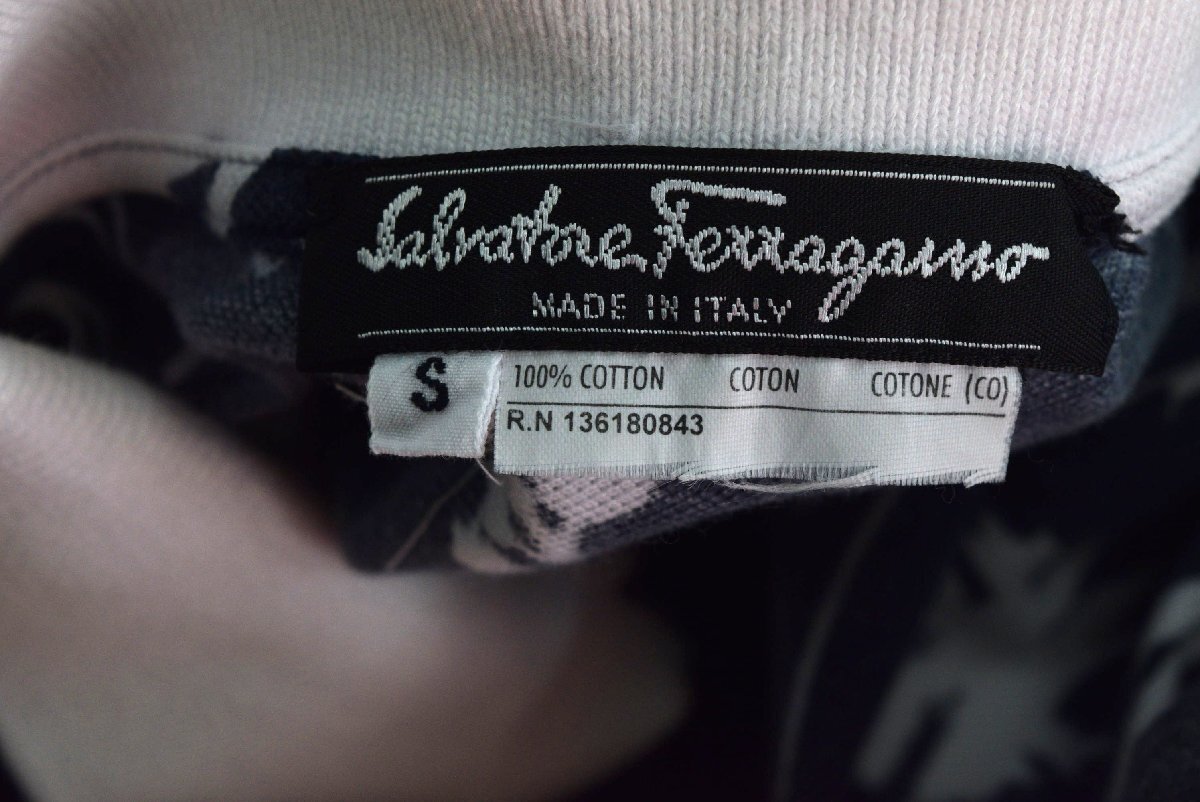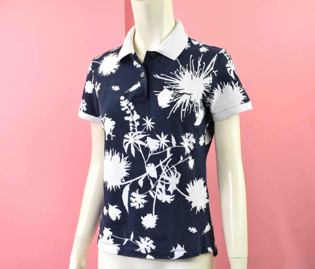 3044-25P0089★FERRAGAMO サルヴァトーレ フェラガモ ★紺白 影絵ボタニカルプリント 半袖ポロシャツ S 鹿の子