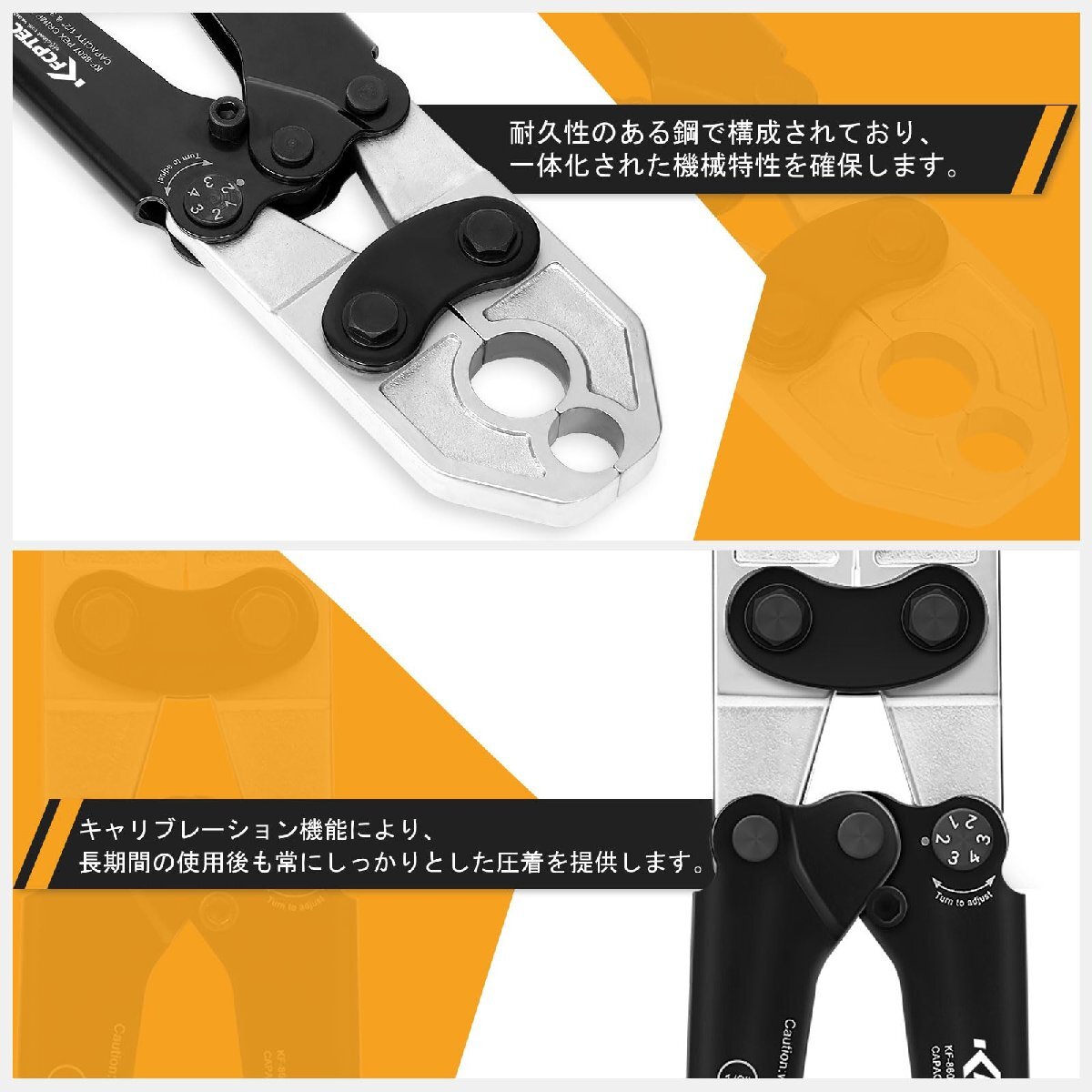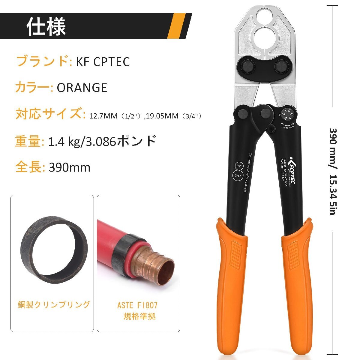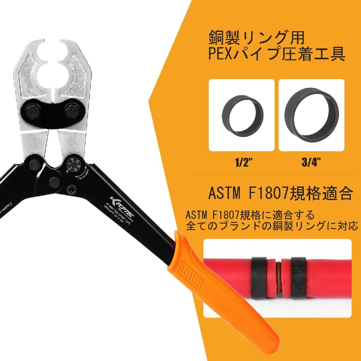 ブランド:KFCPTEC1/2・3/4インチ対応の圧着工具:住宅用給水管施工や配管工事に使われる銅リング(1/2・3/4インチ)に対応したリング圧着工具です。DIYからプロの現場まで幅広く対応。