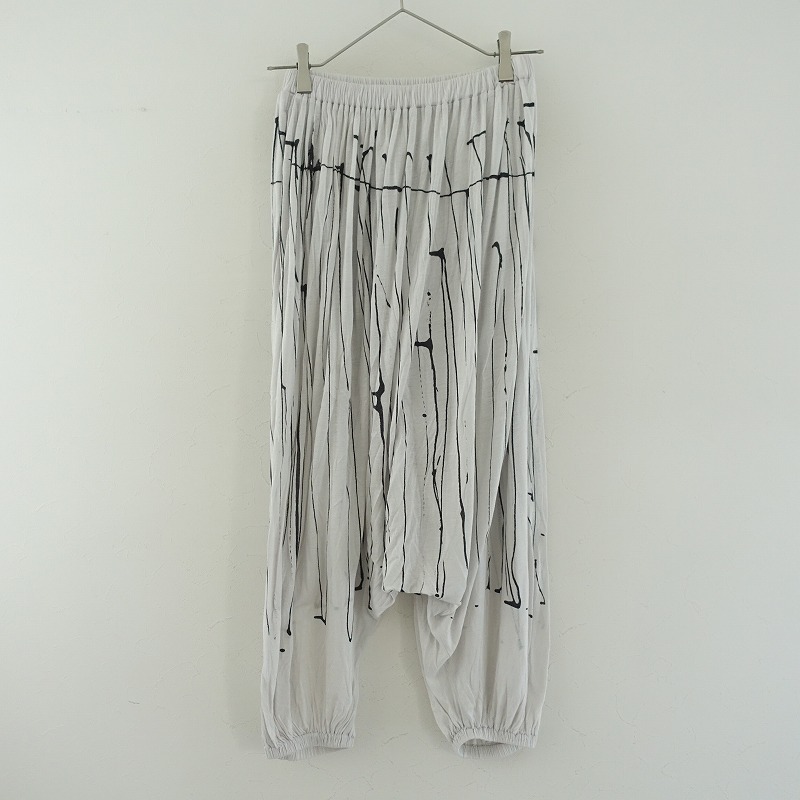 | mina perhonenのrain track シルクカシミヤ混プリントサルエルパンツです。カラーはライトグレー×ブラックで、落ち感のある薄手カットソー地で仕立てられております。股上の深いゆったりとしたサルエルデザインで、ウエスト&裾はゴム入りになっております。 |