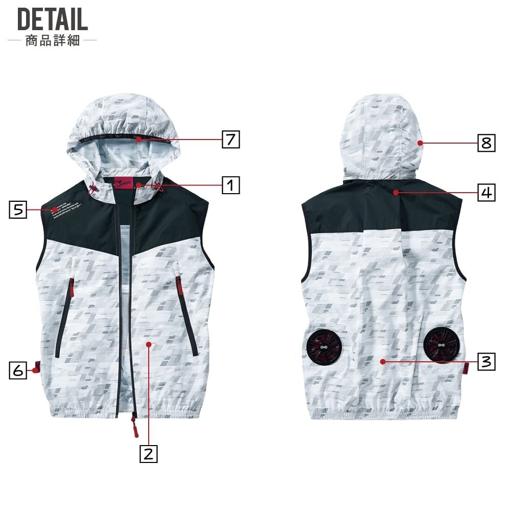 特長:調整紐(首元)/左内側パッテリー専用ポケット/反射プリント/保冷剤用メッシュポケット/首元タック入り/フードパンチング仕様