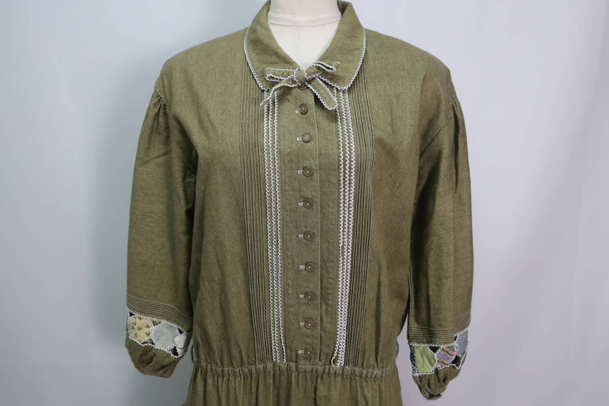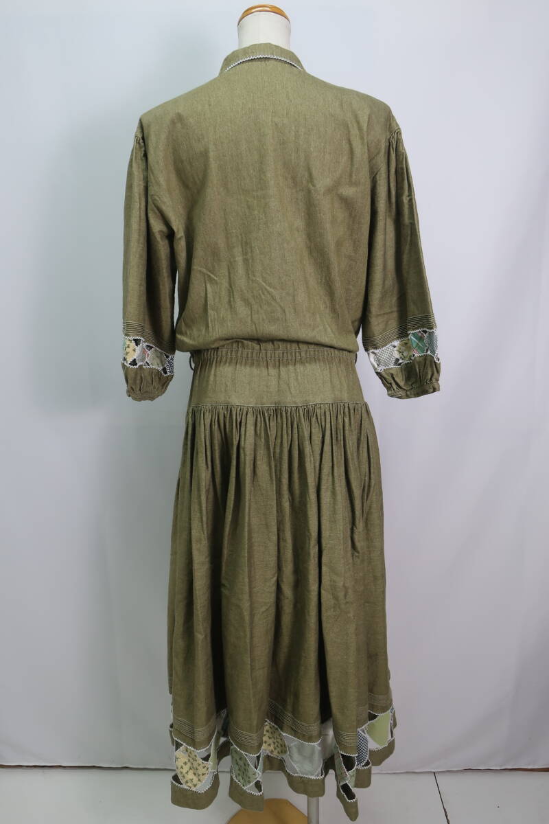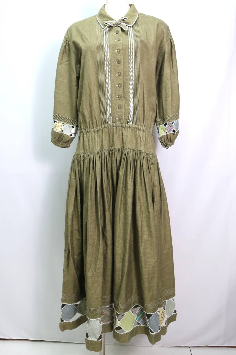 【送900円】1086 PINK HOUSE ピンクハウス 肩パッド付き長袖ロングワンピース パッチワークデザイン 襟付き グリーン系 サイズ不明
