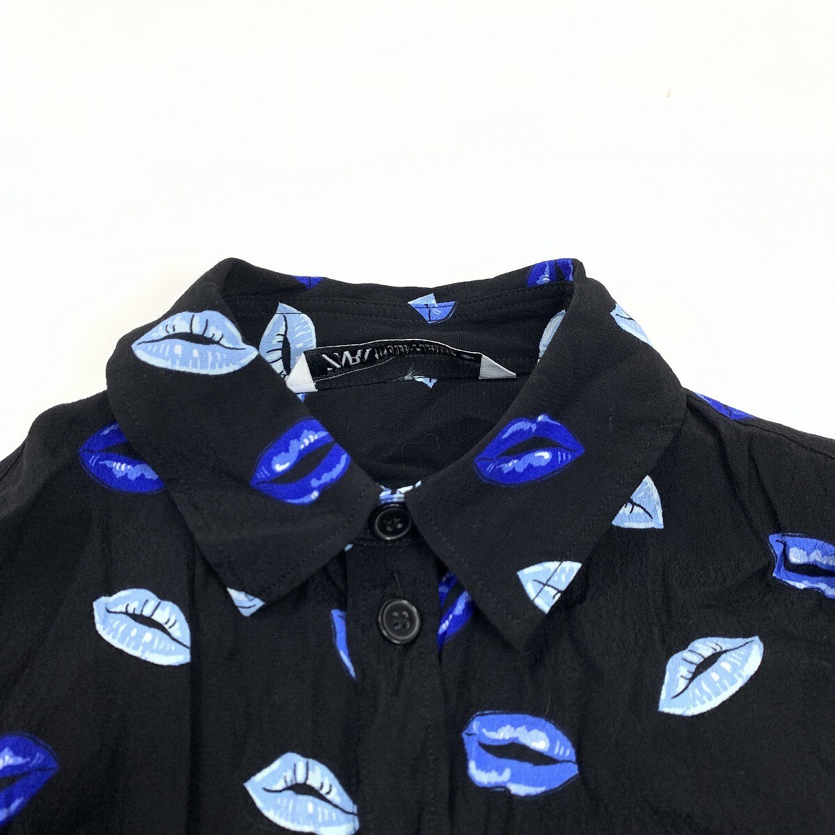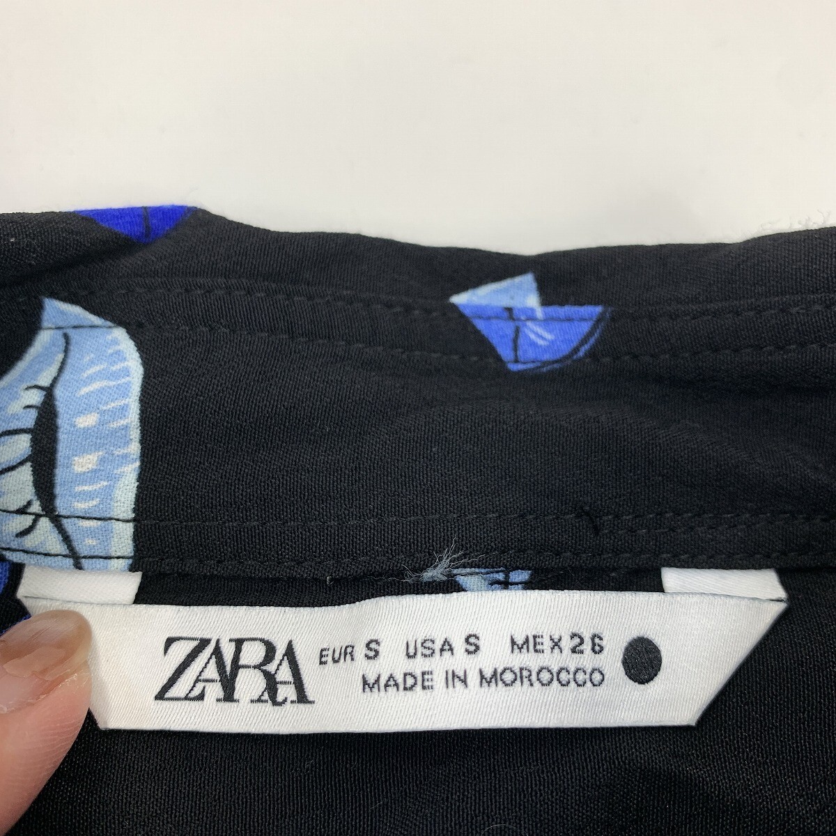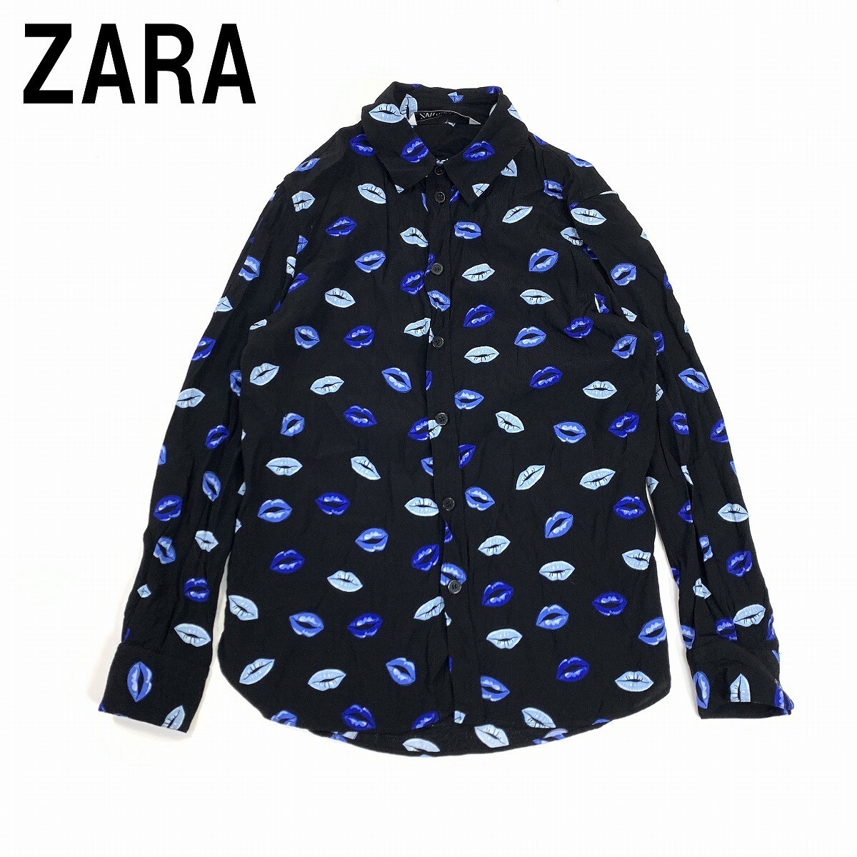 ZARA ザラ 長袖シャツ ブラウス 総柄 黒 青 ブラック ブルー S YC1099