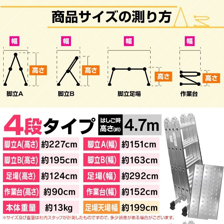 | 商品コード:A19C475 ■商品仕様 [はしご本体] サイズ(約) ├ 折り畳み時:幅 38cm×奥行き 28cm×高さ 123cm ├ ハシゴ時:高さ470cm ├ 脚立時:高さ227cm └ 足場時:幅292cm 高さ124cm 材質:アルミニウム、スチール 重量(約):13kg 耐荷重(約):100kg ステップ数:4段×4 [専用プレート] サイズ(約):【小】87cm×32.5cm×1.2mm / 【大】115.5×32.5×1.2mm 重量(約) :【小】2.3kg / 【大】3.0kg 材質:スチール鉄板 ■商品内容 本体 ×1 専用プレート ×2 ■保障期間 7日間 ※商品到着後7日以内の初期不良・破損のみご対応させていただきます。 ■注意事項 ※海外製品で、簡易梱包での輸入のため風防に擦れや多少の小キズなどがある場合がございますが、商品自体には問題ありませんのでご了承下さい。 ※商品は、モニターによって色合いが異なって見える場合があります。 ※折りたたむとき、指などを挟まないようにご注意下さい。 ※仕様・デザインは改良のため予告なく変更することがあります。 ※こちらの商品は、在庫切れになりやすい人気商品となりますので、即決落札・早期ご入金を推奨しております。 【もちろん新品未使用品です】 |