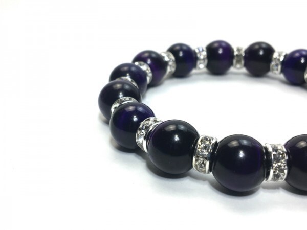 こちらは、12mm玉のパープルタイガーアイを使用した天然石ブレスレットです。石との間にはロンデルを挟み高級感を演出しています。シンプルなデザインですのでどんなコーディネートとも合わせ易いブレスレットです。石大きさは12mm玉です。内径約18cmです。(サイズ変更の場合は取引ナビにてご連絡をお願いします。) 数に限りがございますので気になる方はお早めにどうぞ。