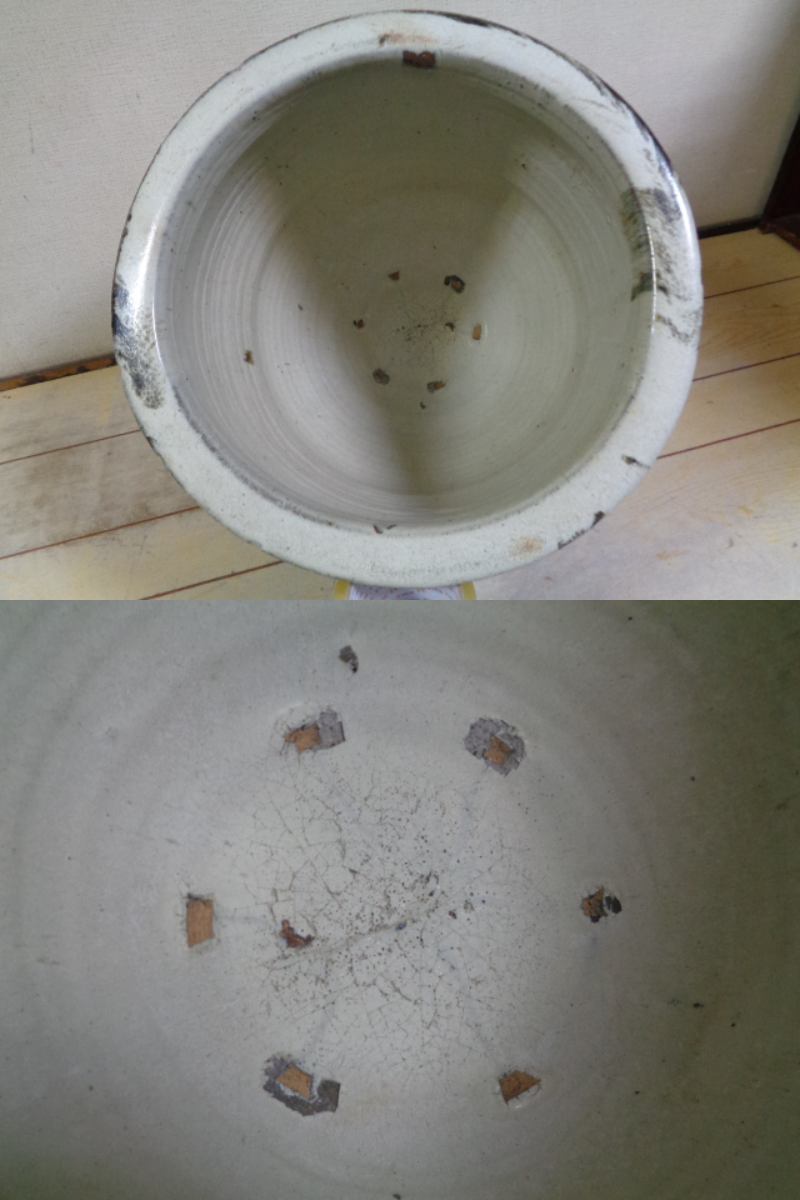 サイズ約、幅44.5cm  高47.5cm 重さ18kg     無傷。正面より右側へ傾向いております。尚、底面に厚さ約1cm程度の物を敷くと、傾きが収まります。時代しみ汚れ、擦れ傷、窯キズ等有ります。入手した状態での出品になります。縁内側に(画像8)汚れが有ります。古い物ですのでご理解頂ける方、終了2日以内の返信、入金頂ける方お願い致します。商品到着後、受け取り完了の操作お願い致します。