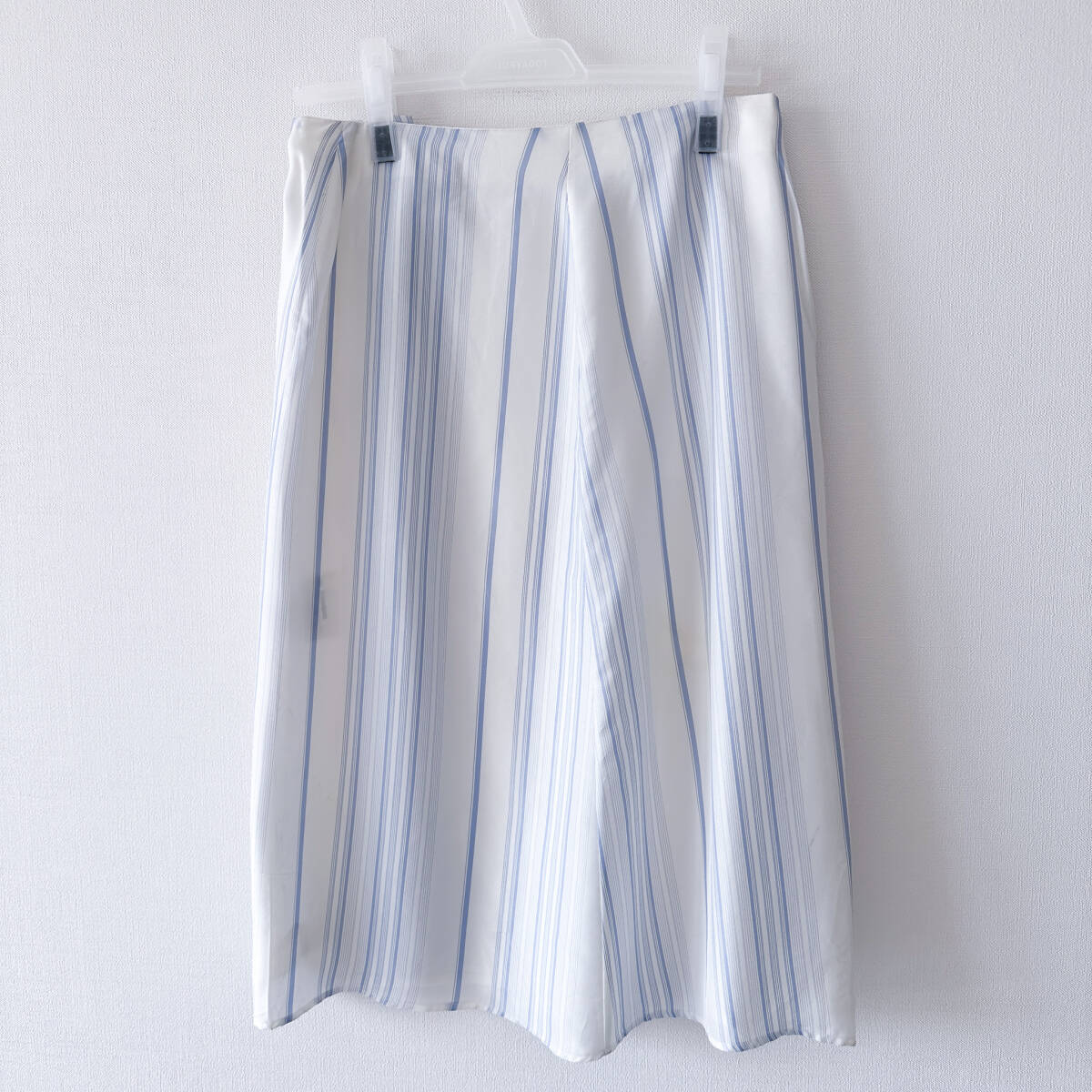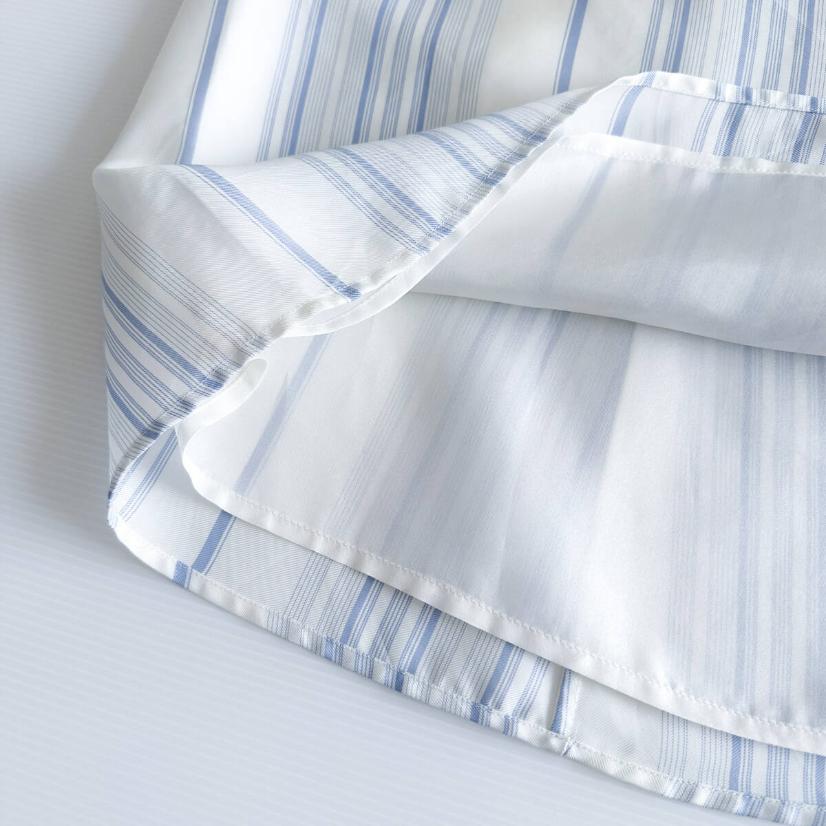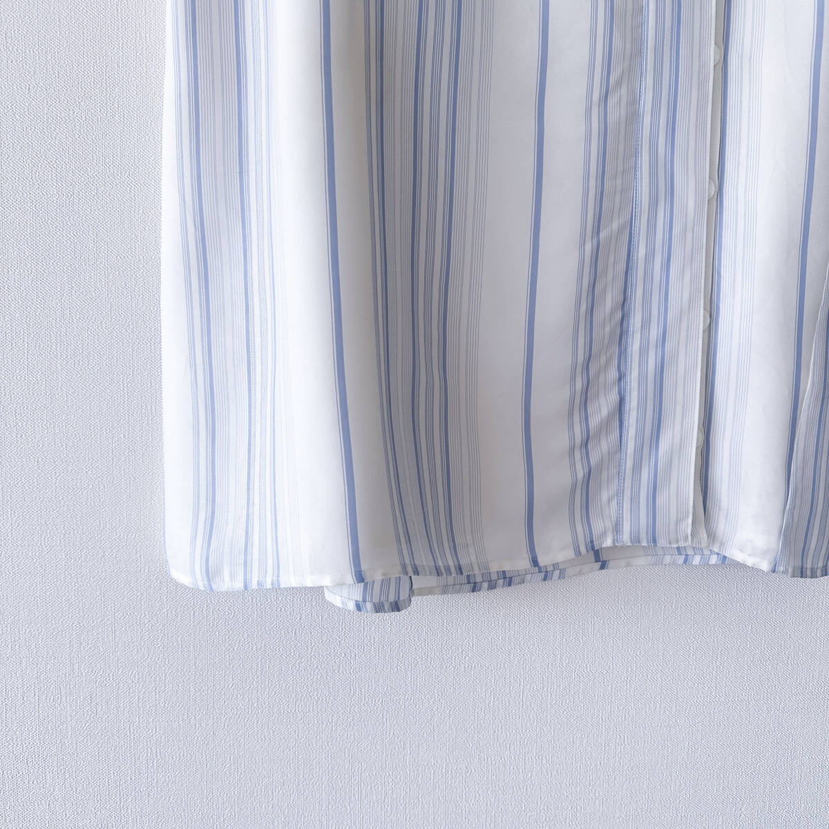 ホワイト×ライトブルーの爽やかなストライプに、すとんと落ちるレーヨンのドレープが映え、