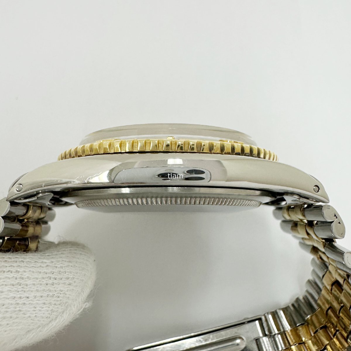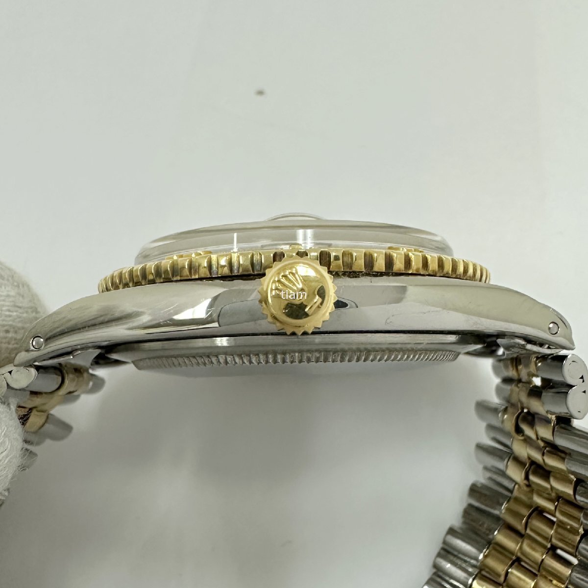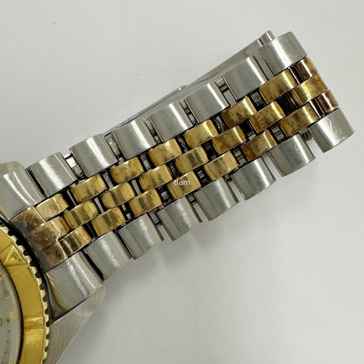 | ガラス: 表面小傷がございます。 ダイヤル/針: 針劣化、ダイヤルにシミ、フチに黒ずみがございます。 ケース/ベゼル: 小傷がございます。 ブレス: ヨレが強くございます。金の変色がございます。 その他: | ||
