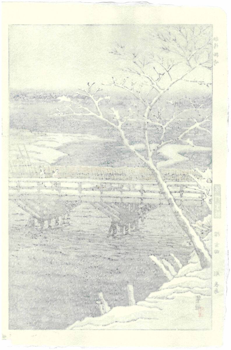 真作保証   額装 笠松紫浪 木版画  #28 越後柏崎 新版画  初版 昭和中期    ご自宅で古き良き日本の風景の魅力をご堪能下さい!!