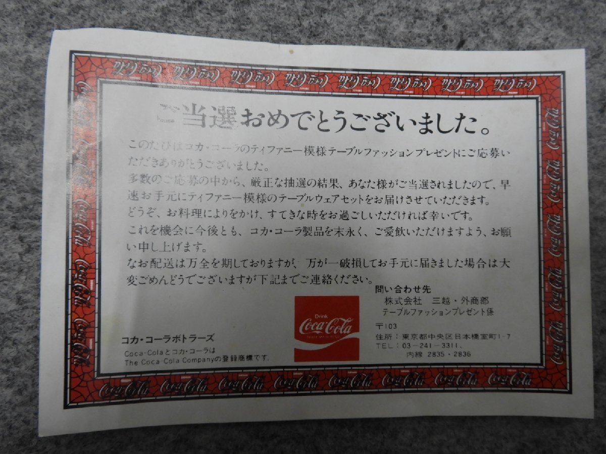当時コカコーラが開催していた「ティファニー模様テーブルファッションプレゼント」というキャンペーンに応募した中から抽選で当選した方へ送られたものです。