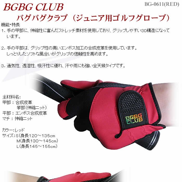 ◆ バグバグクラブ ジュニア用ゴルフグローブ(レッド) ◆