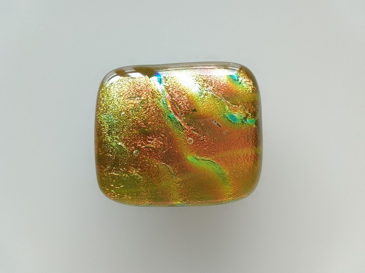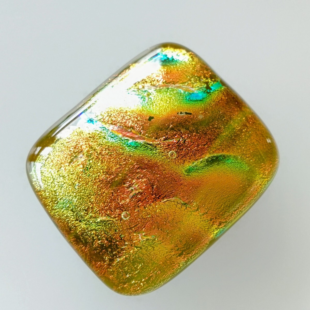 美しいダイクロガラスを電気炉で焼いた帯留め。