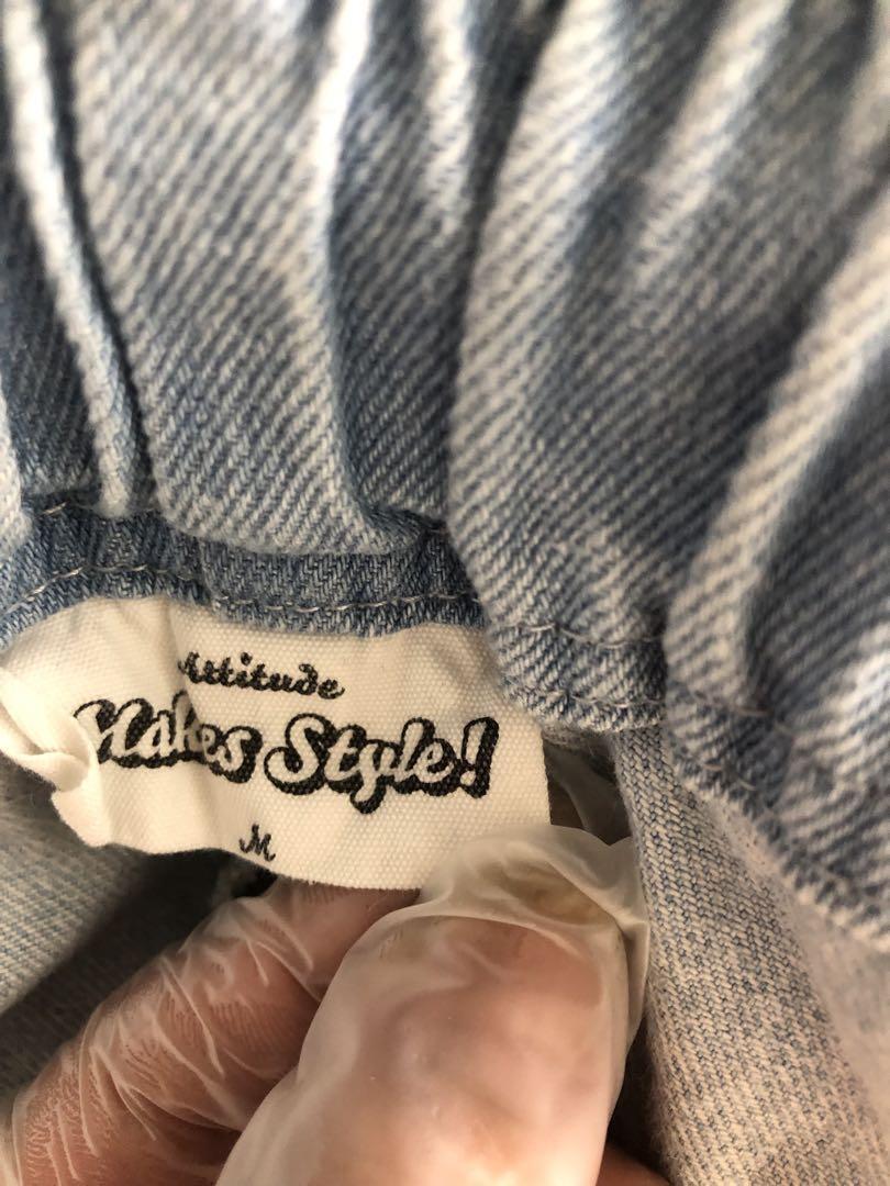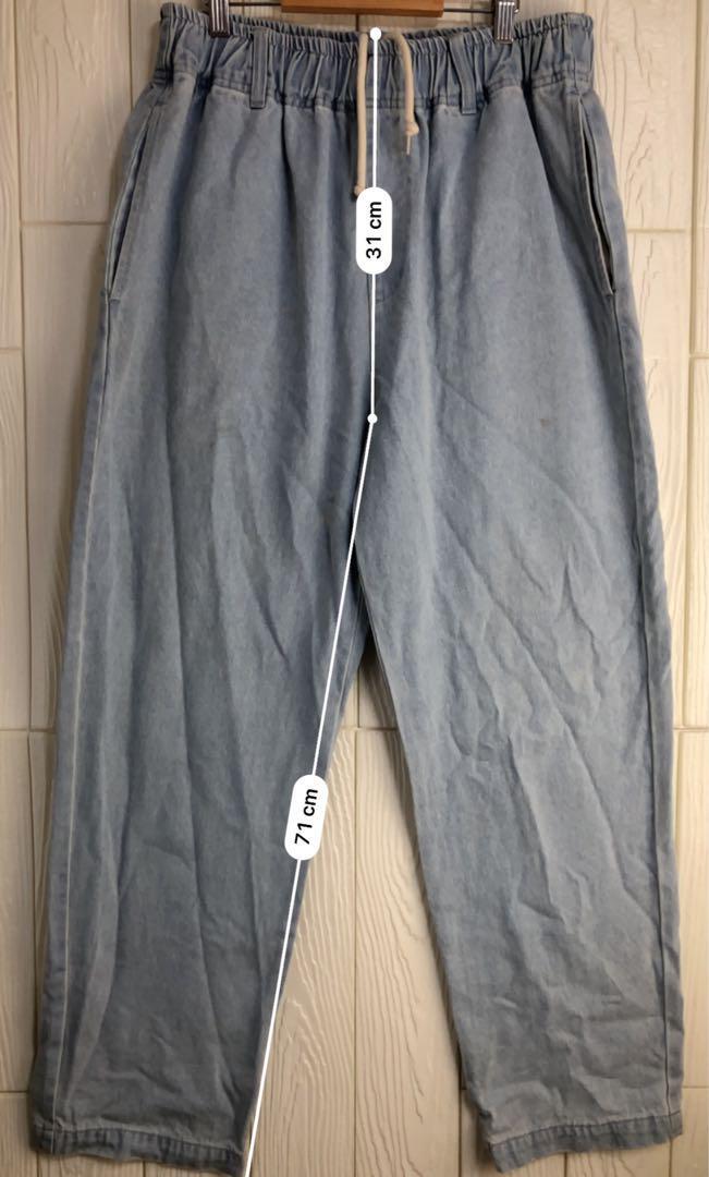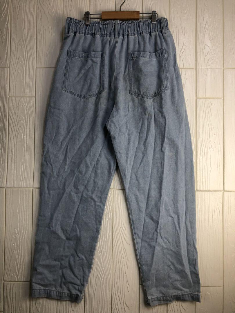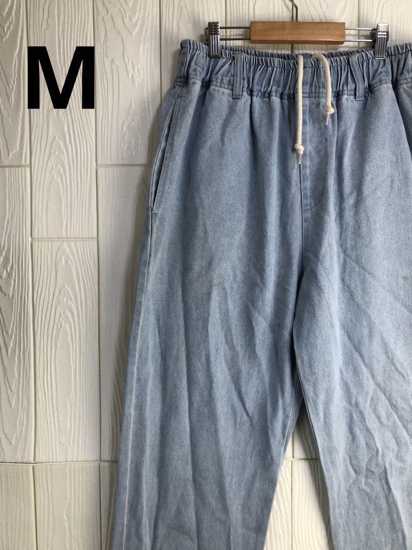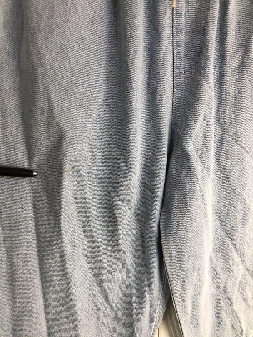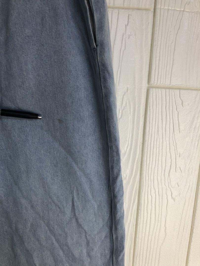 ライトブルーのデニムパンツ、ウエスト76cm、股下71cmで快適なフィット感。