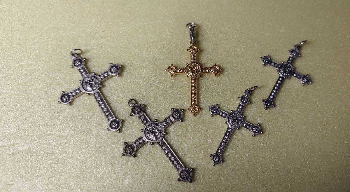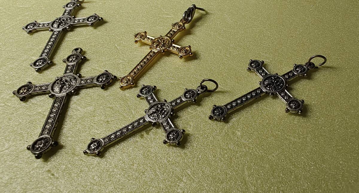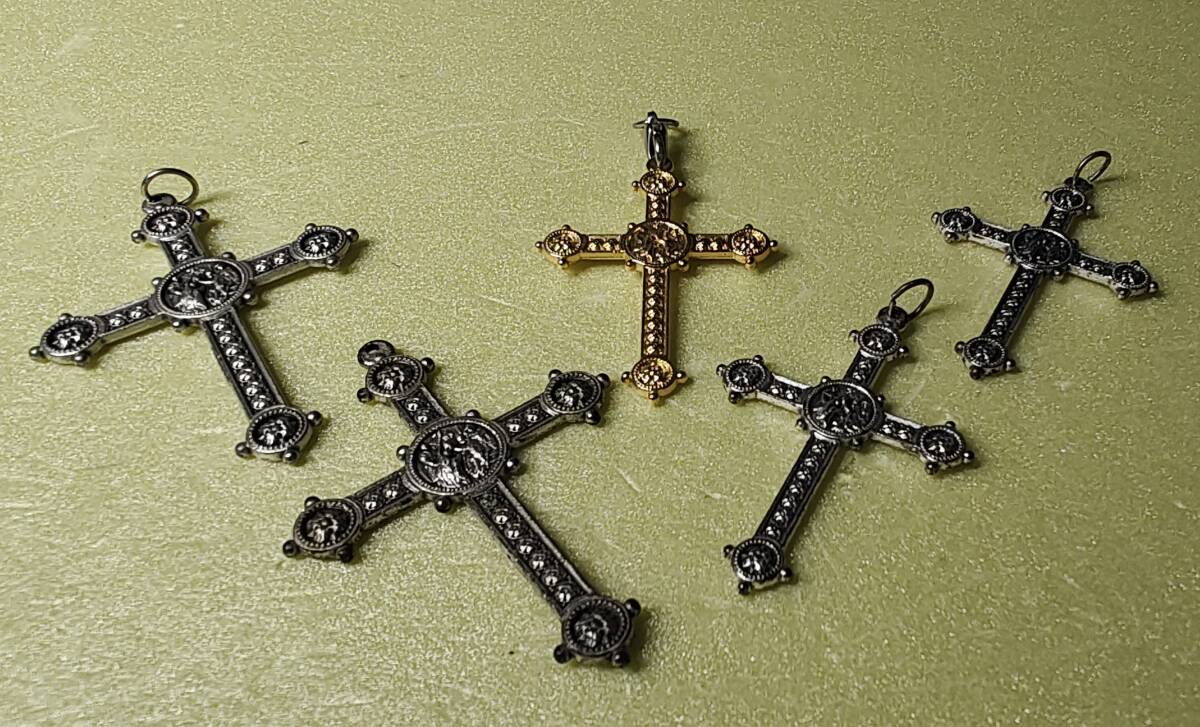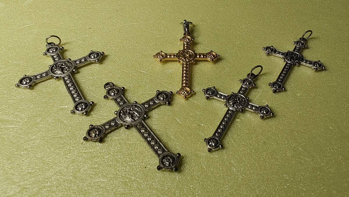 アクセサリー十字架5個まとめてどうぞ!ゴールド1個。シルバー4個のまとめての出品です。2個のサイズは縦50㎜。横:39㎜です。3個は縦:45㎜。横:30㎜です。(画像2で説明)注)個人保管の未使用ですが保管管理上、あまり神経細かい方、細部まで気になさる方は一切ご遠慮いただきますようお願い致します。気になる方は直接ショップ等でお探しいただいてお買い求めください。ノークレーム、ノーリターンですのでよろしくお願いいたします。なお、トラブル防止のため、評価の悪い方や新規の方は入札、落札されても削除させていただきますのでご了承ください。
