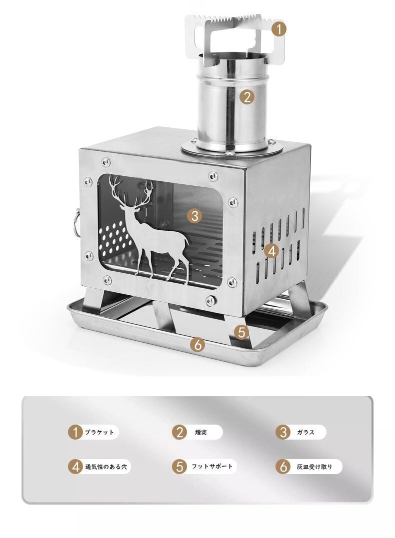 薪 ストーブ アウトドア 調理器具 暖炉 キャンプ 煙突付き 耐熱ガラス窓付き 屋外 小型焚き火台 BBQ コンロ ステンレス鋼 ■ポータブル小型ステンレス製薪ストーブ、防火窓のデザイン、折りたたみ式で収納可能、持ち運びが簡単、屋外キャンプやピクニックでの使用に非常に適しています。