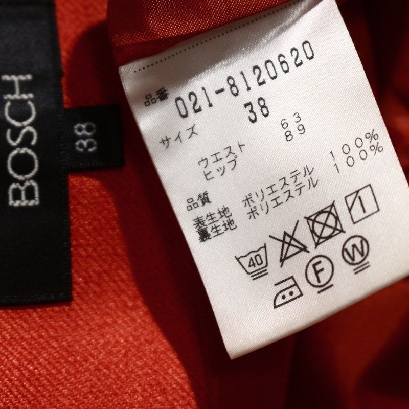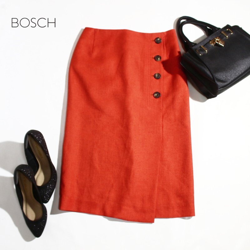 美品 BOSCH ボッシュ 秋 合物 きれい色 上品 ポリエステル スーツ ミディ タイトスカート 9号 38 濃い オレンジ オフィス 通勤 コンサバ