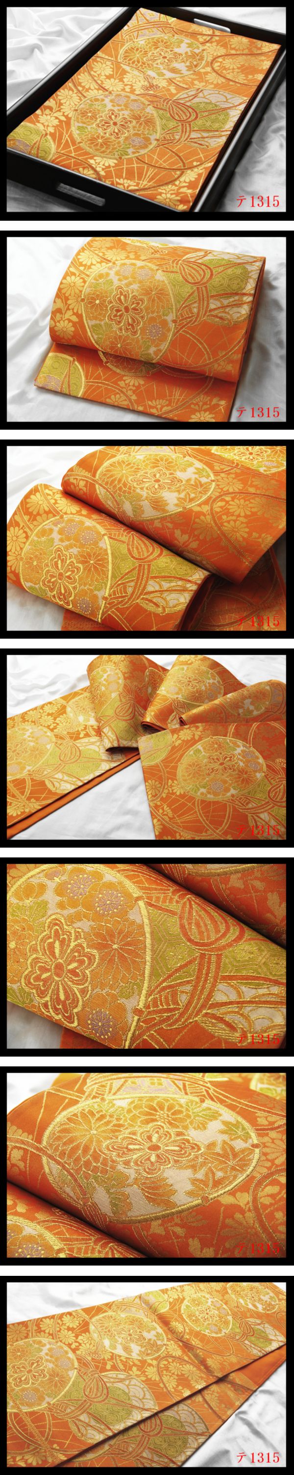 蔵【テ1315】西陣逸品 振袖可 鼓紋 蜜柑色地 華やぎの品格 正絹純金糸六通高級美術袋帯 ◇検◇簪着物名古屋帯和装小物帯締め
