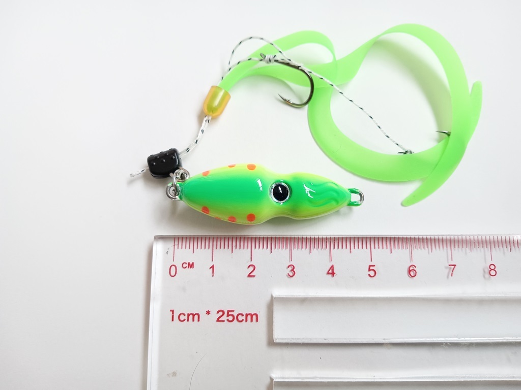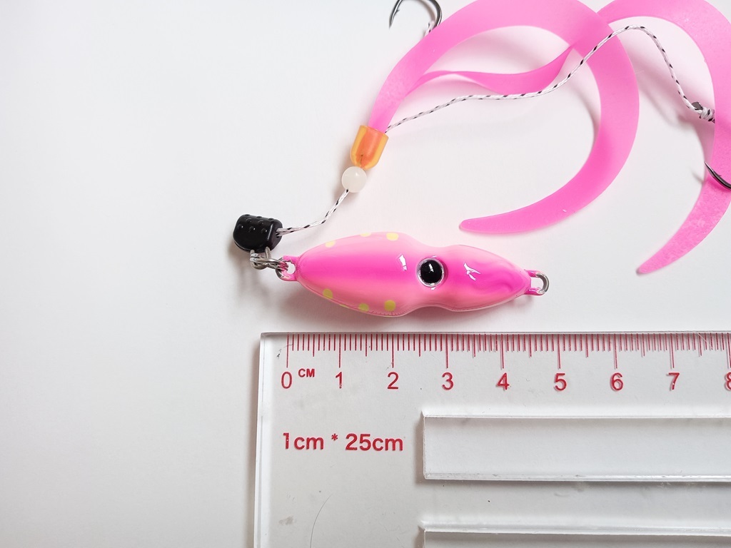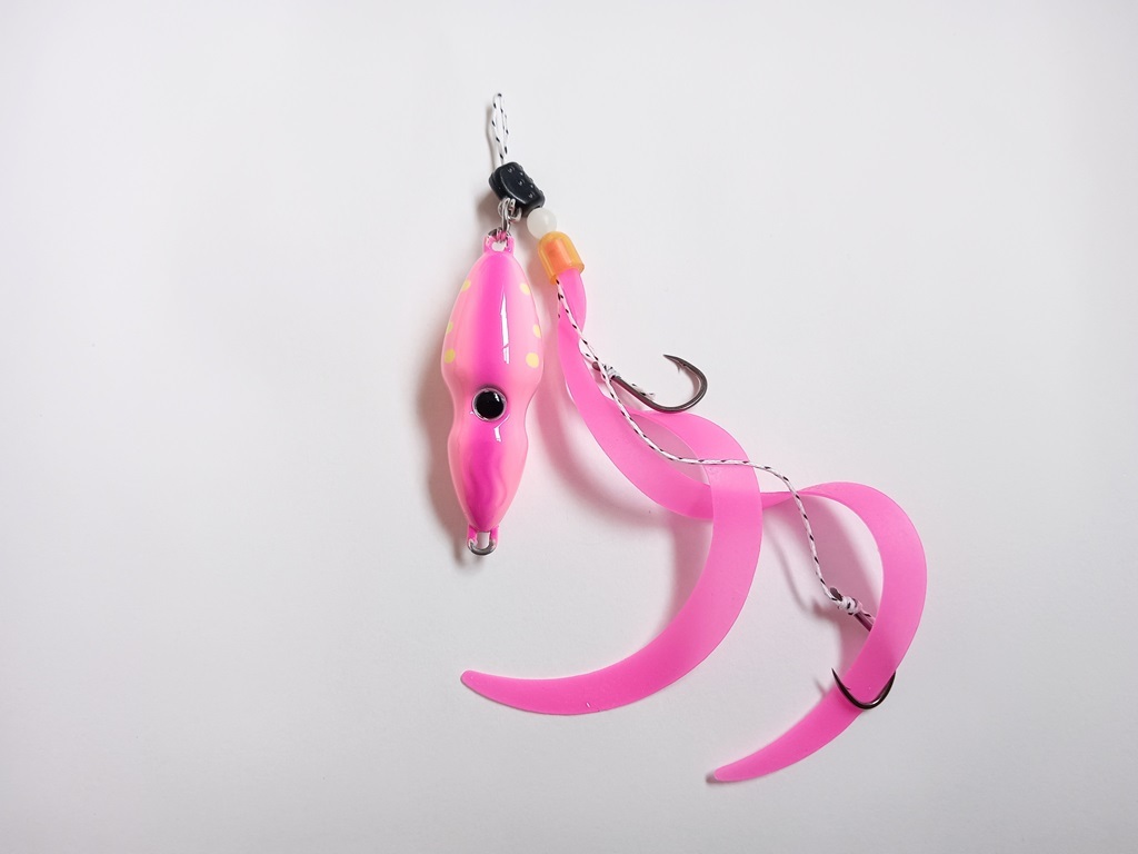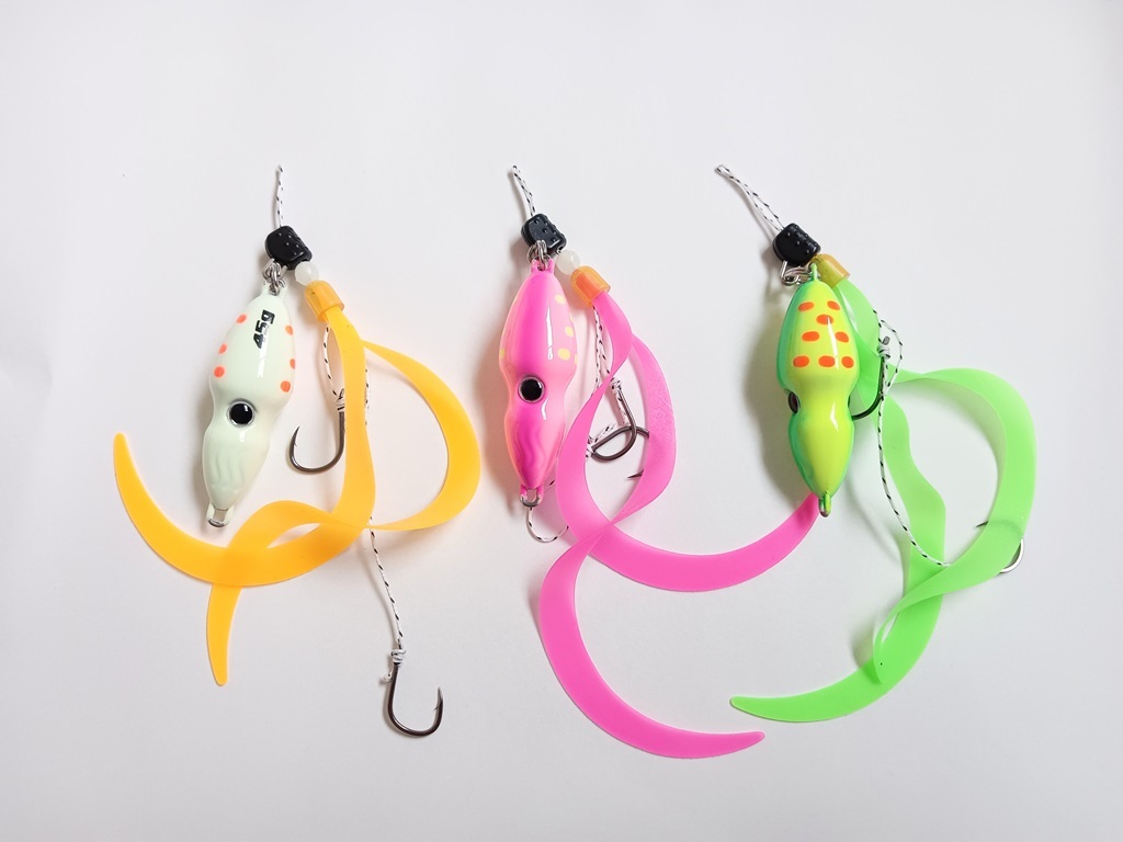 オモック 45g スカート付き イカ型 3色セット 夜光 グリーン ピンク ホワイト 鯛ラバ タイジグ 蓄光 発光 グロー マダイ アマダイ アマラバ