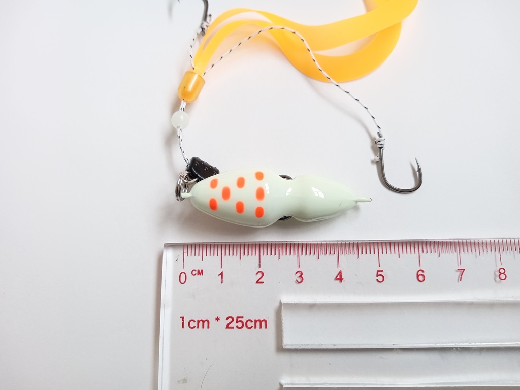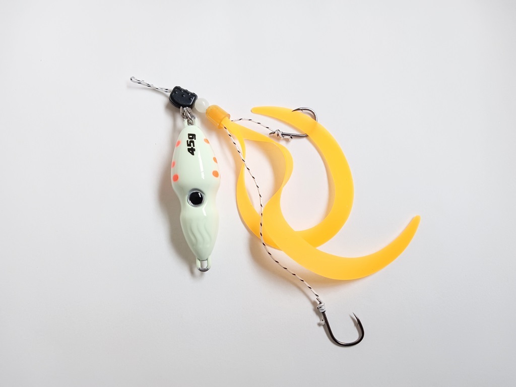 本体に夜光塗料が塗られており、深くて光が届きにくい場所・夜間(ナイトゲーム)に発光し、魚にアピールします。