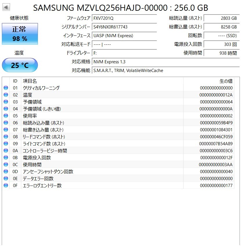 ◆◇正常品 SSD256GB◆使用時間少ない 938時間◆M.2 2280 NVMe◆SAMSUNG MZ-VLQ2560◆フォーマット済◆送料185円◆追跡可能◇◆