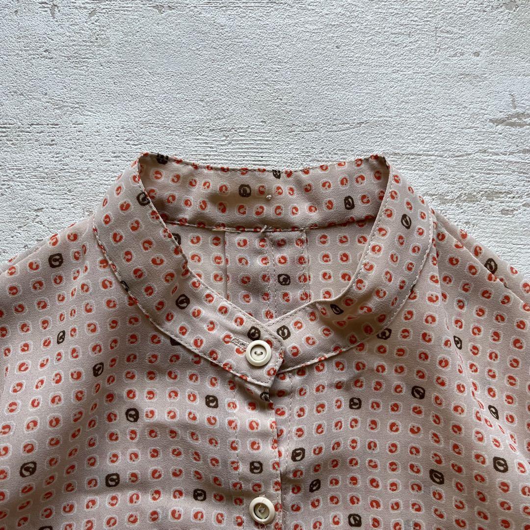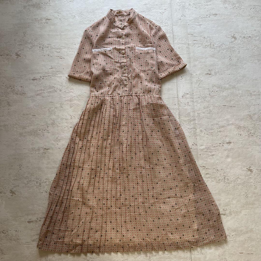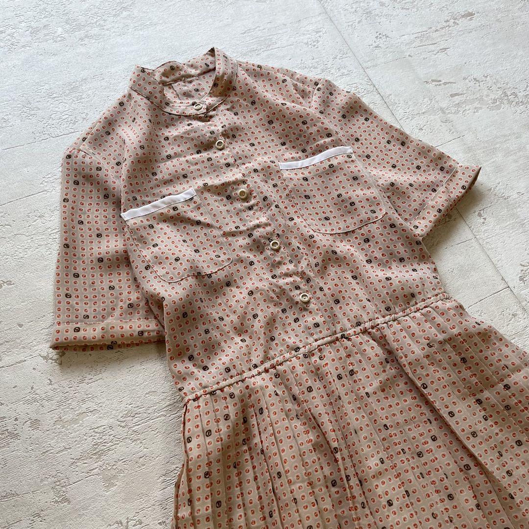 レトロ感あふれるヴィンテージ調のシャツワンピースです。ベージュを基調に赤やブラウン系の小さな幾何学風ドット柄が散りばめられ、どこか昭和レトロな雰囲気を楽しめます。前開きボタン仕様で着脱もラクにでき、スタンドカラーとウエスト切替のデザインが上品なシルエットを演出。両胸には便利なポケット付きで、デイリーからお出かけまで幅広く活躍します。七分袖なので春?秋にかけて長く着用でき、カーディガンやジャケットとのレイヤードにもおすすめ。古着やヴィンテージファッション好きな方にぜひ。