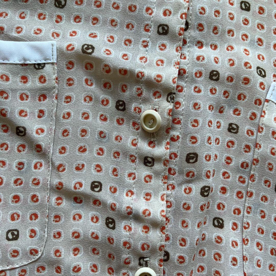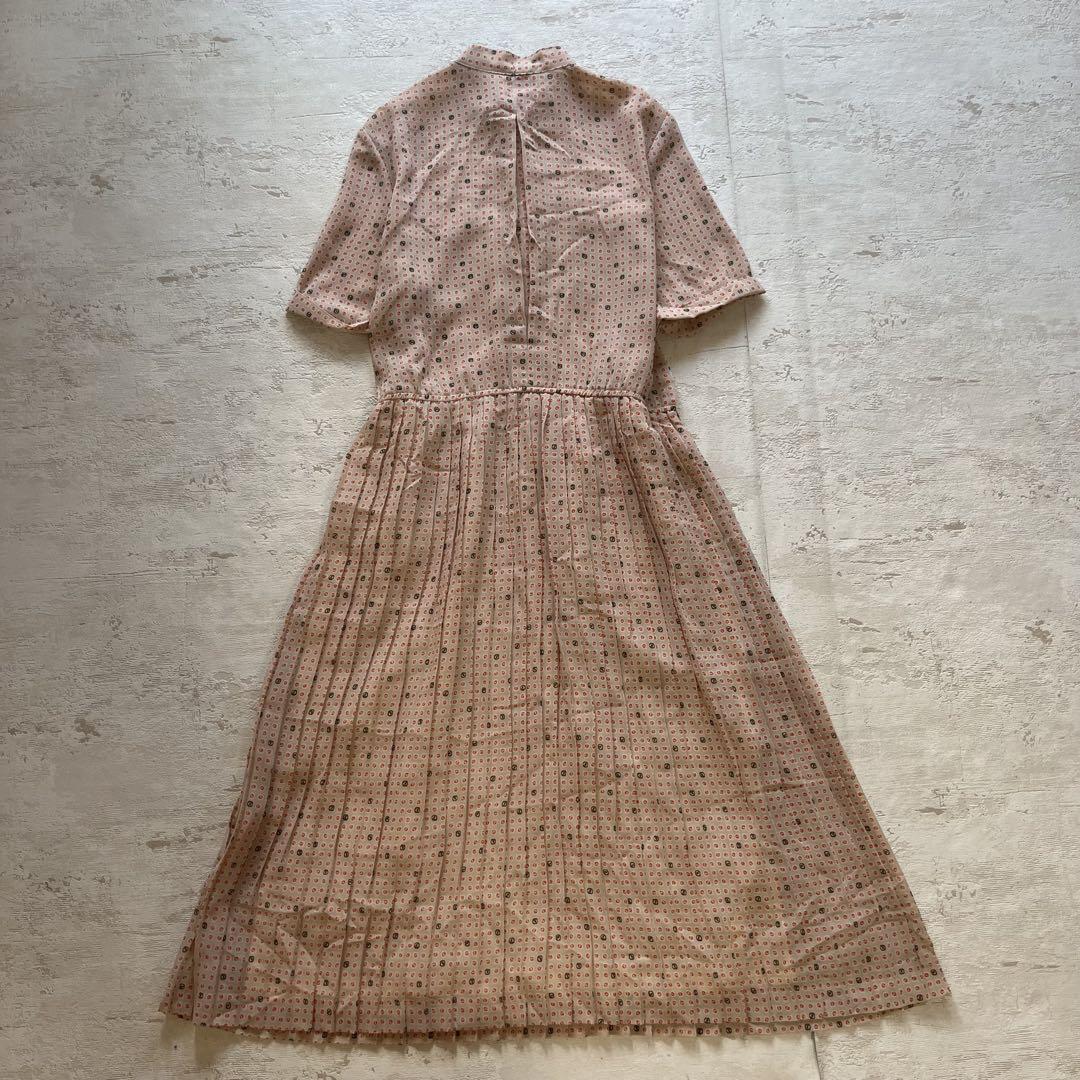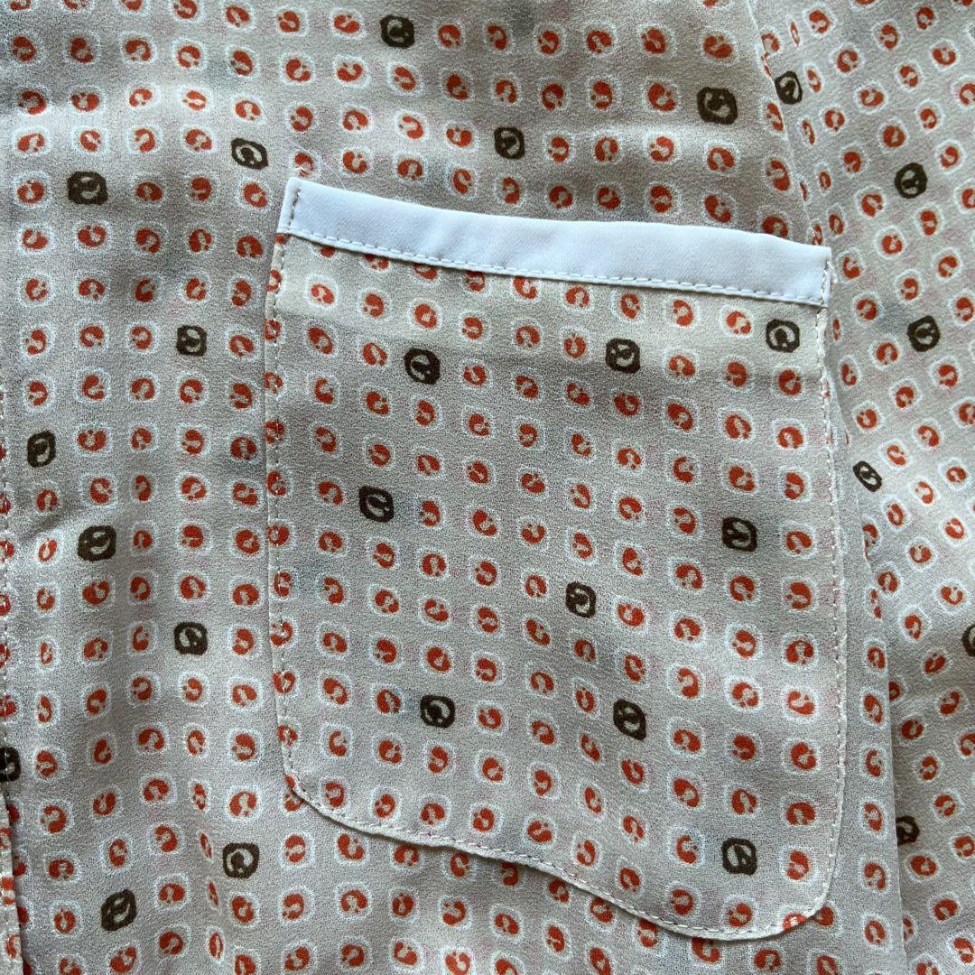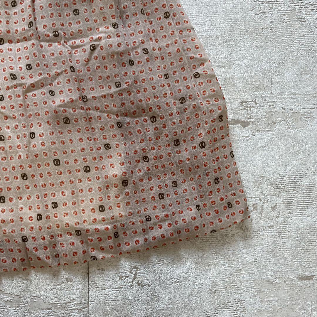 レトロ感あふれるヴィンテージ調のシャツワンピースです。ベージュを基調に赤やブラウン系の小さな幾何学風ドット柄が散りばめられ、どこか昭和レトロな雰囲気を楽しめます。前開きボタン仕様で着脱もラクにでき、スタンドカラーとウエスト切替のデザインが上品なシルエットを演出。両胸には便利なポケット付きで、デイリーからお出かけまで幅広く活躍します。七分袖なので春?秋にかけて長く着用でき、カーディガンやジャケットとのレイヤードにもおすすめ。古着やヴィンテージファッション好きな方にぜひ。