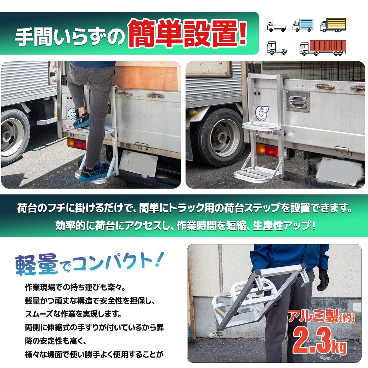 トラックの荷台に乗り降りしやすいように設計されたアルミ製のステッパーです。