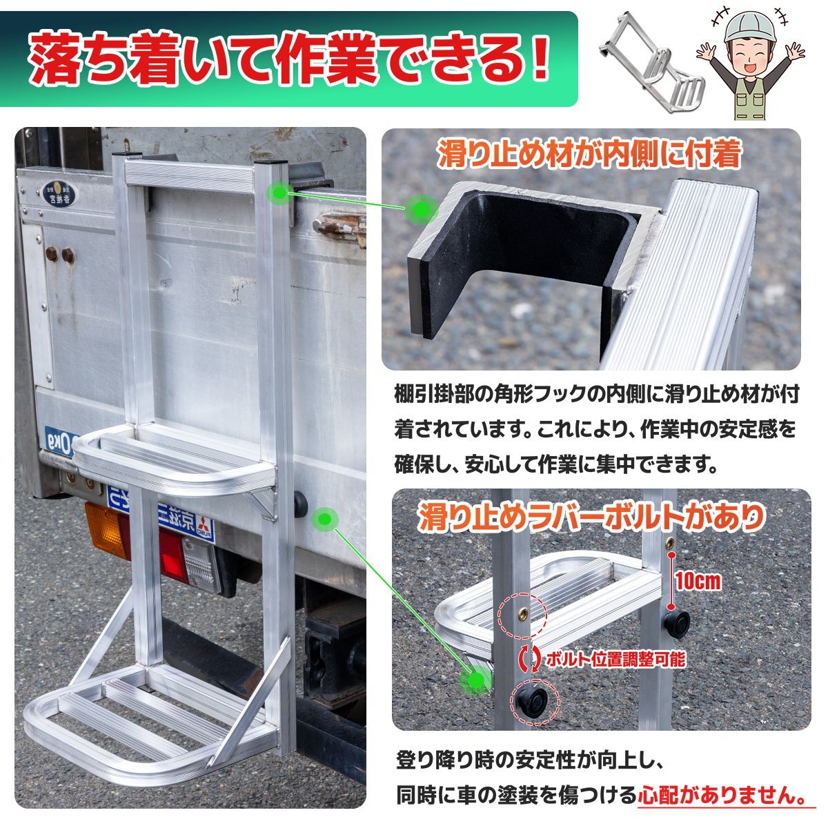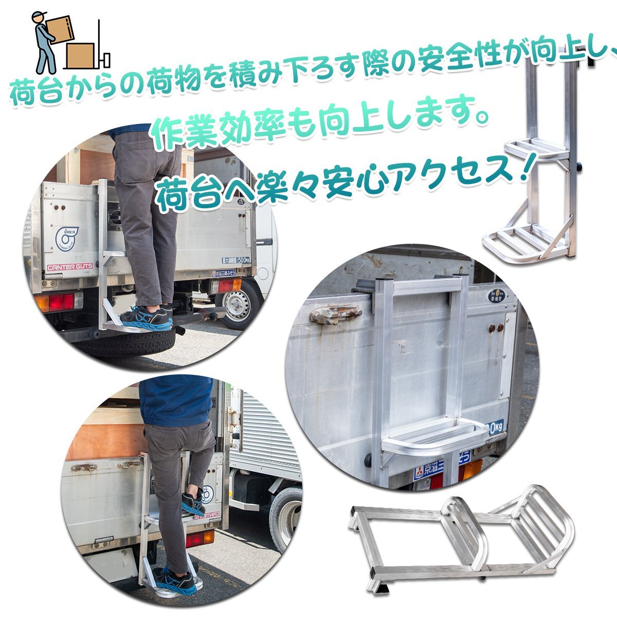 トラックのアオリや荷台に掛けるだけで、手軽に頑丈な足場が設置でき、荷物の搬入搬出作業に大変便利です。