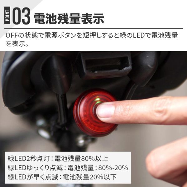 ライトがオフの状態で電源ボタンを短押しすると、緑色のLEDが電池残量を表示してくれます。