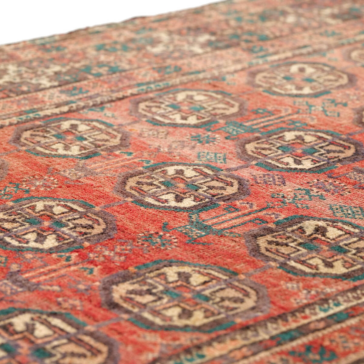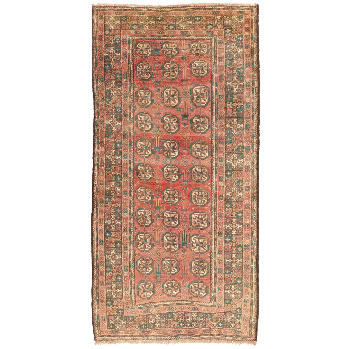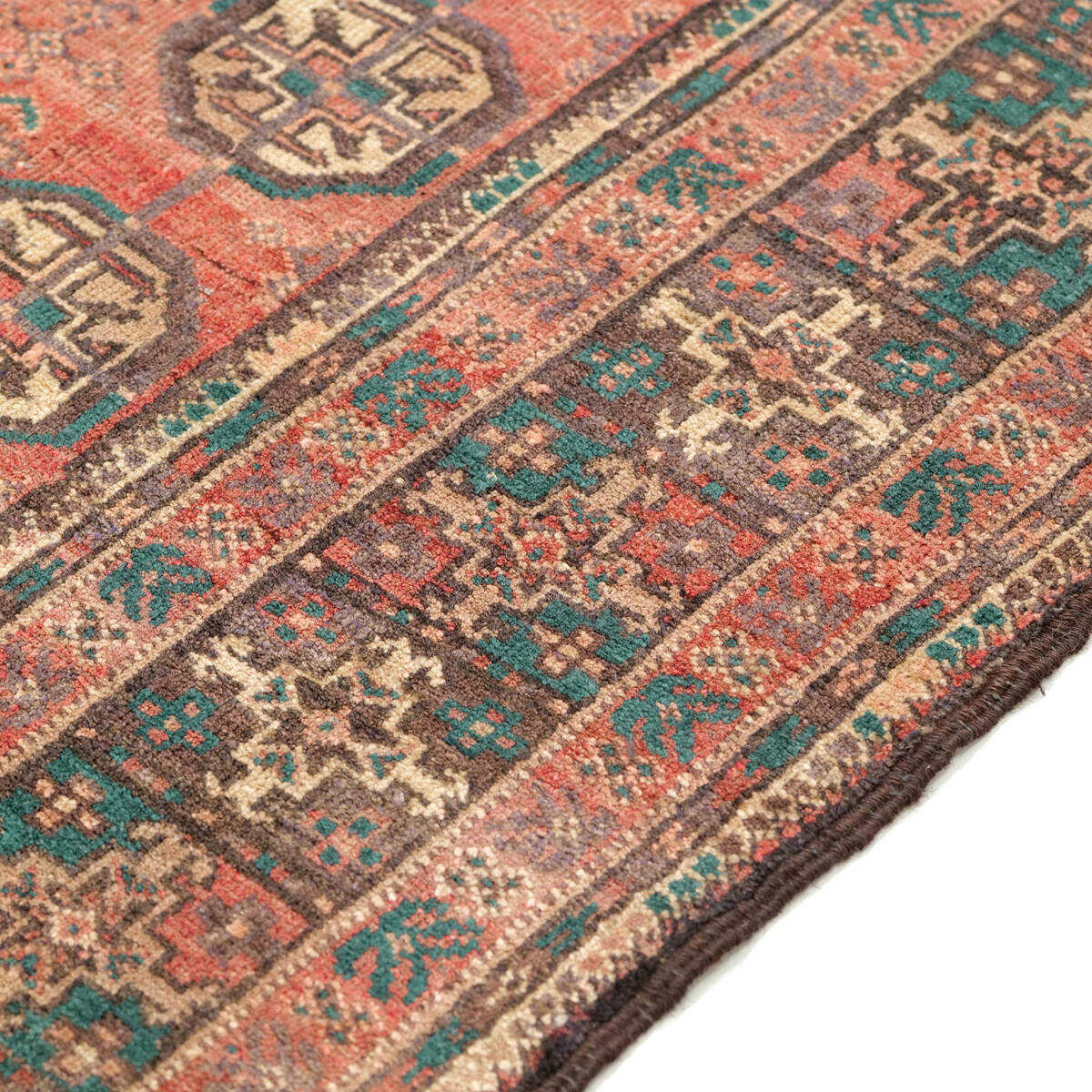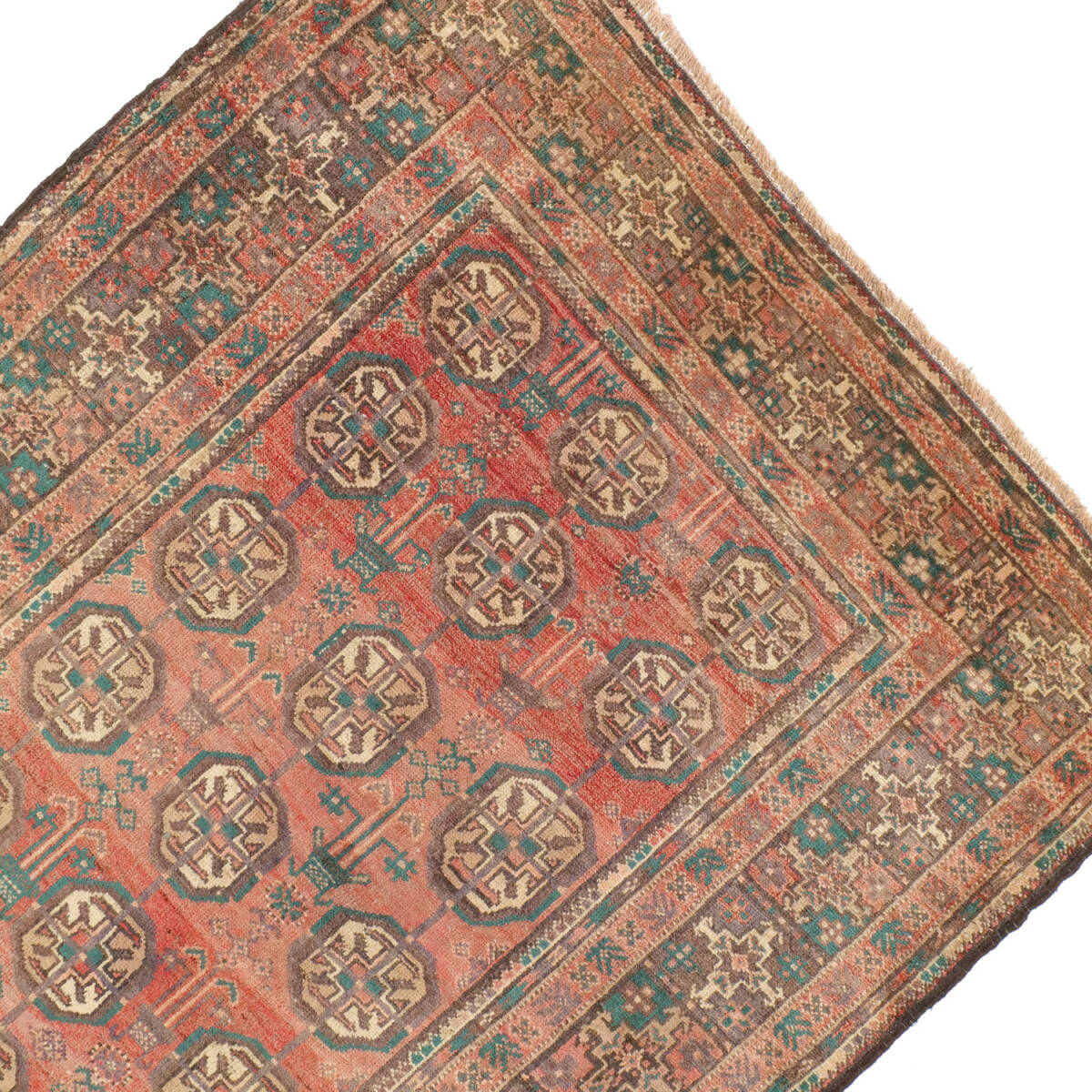 1950年代に制作されたザーボル産のセミアンティークラグです。フィールド全体にサリクギュルが規則的に配され、落ち着いた赤地にベージュや緑が映える伝統的な構成が特徴です。周囲の多重ボーダーは繊細な小紋様で縁取られ、上品な雰囲気を漂わせています。