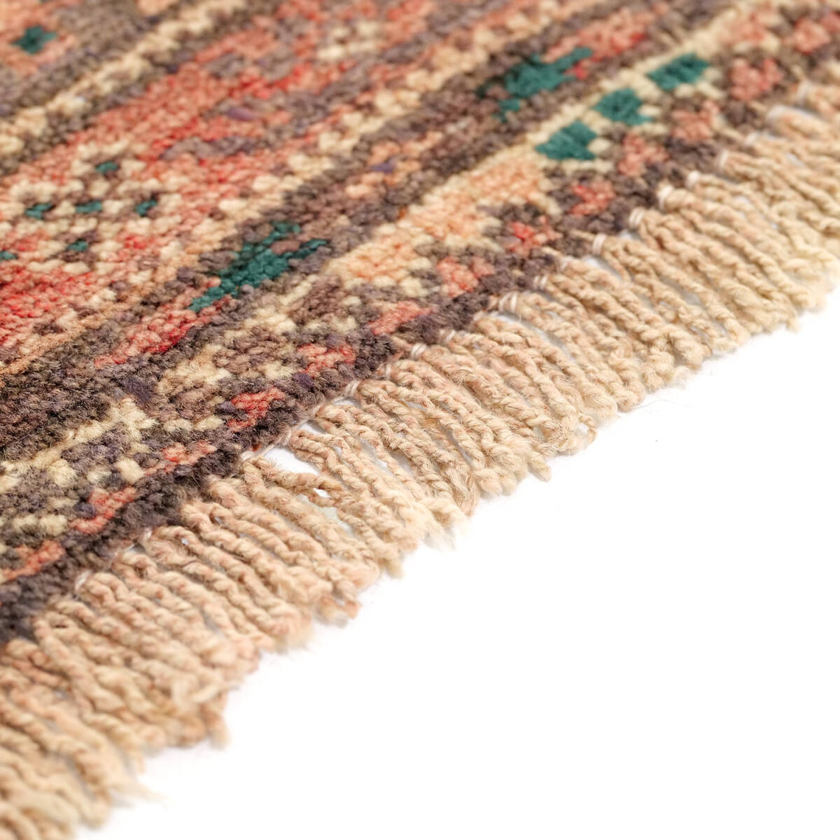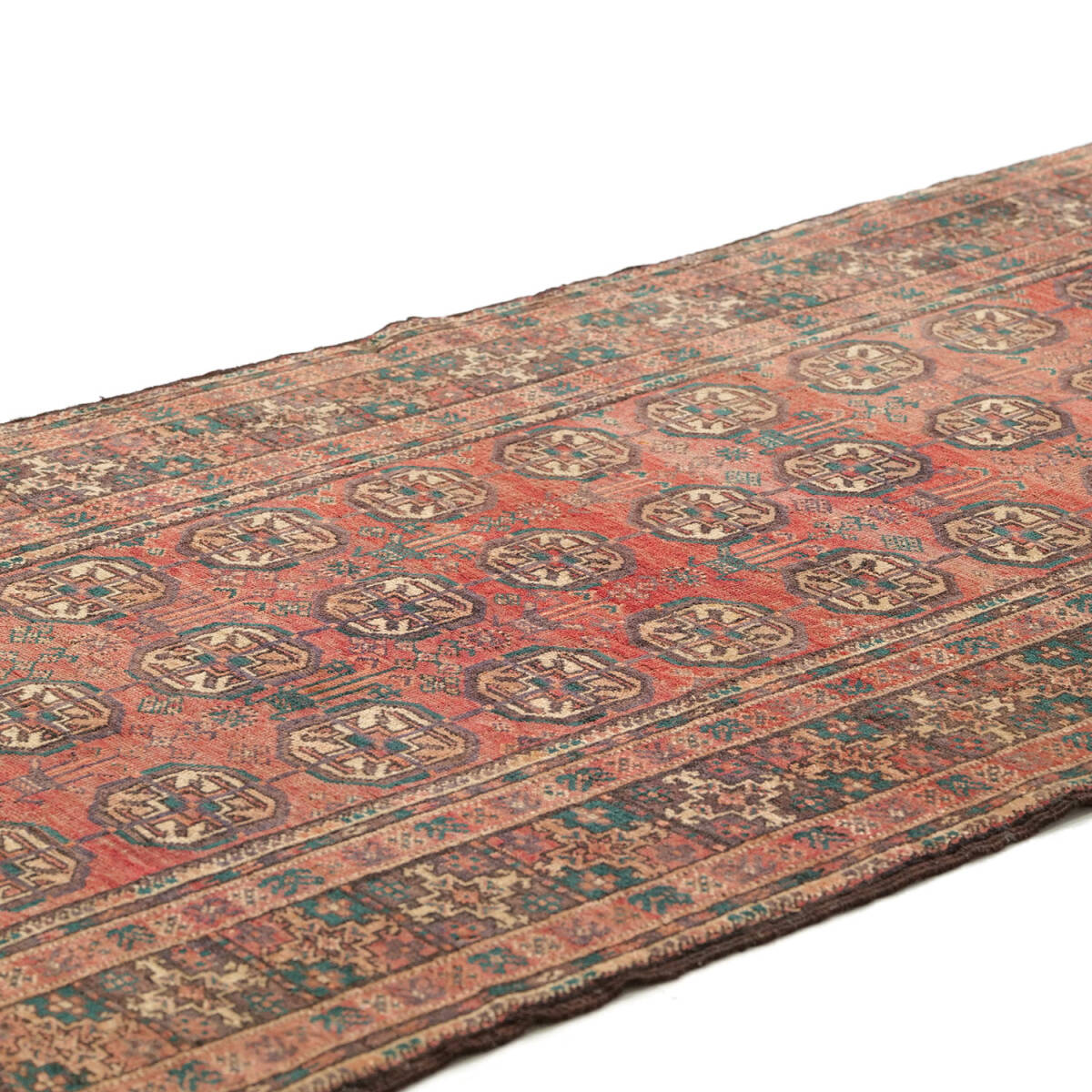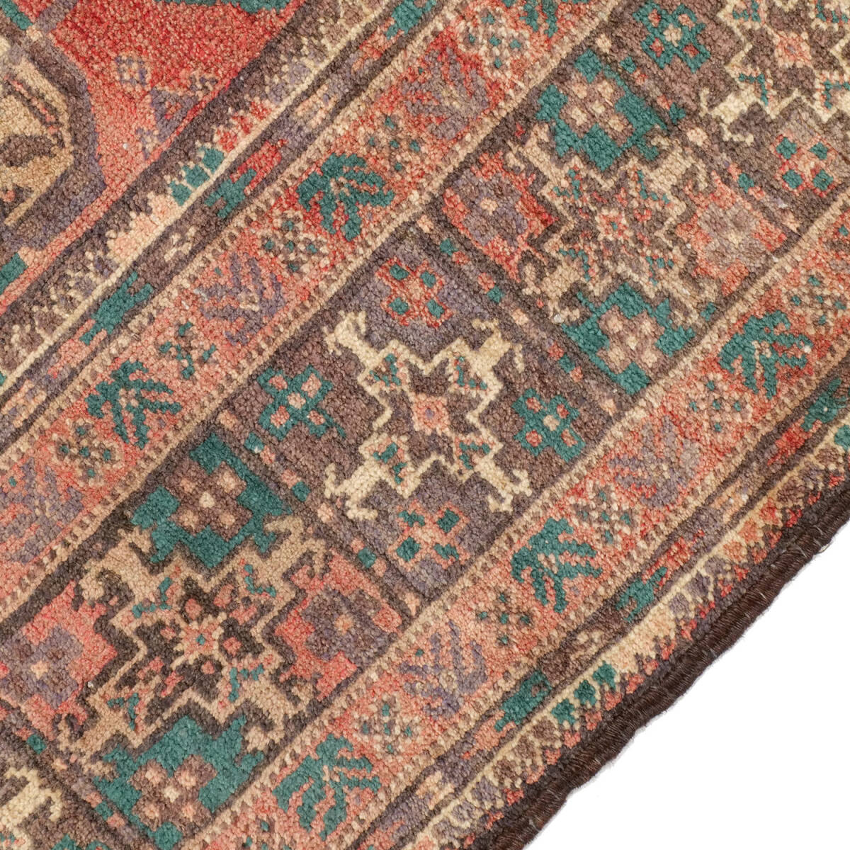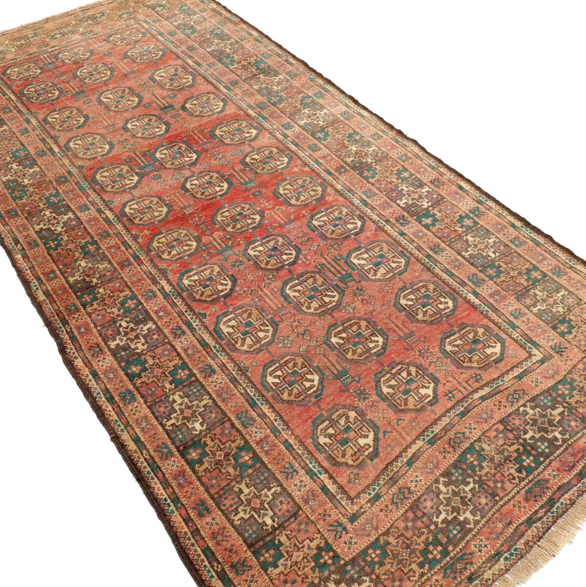 1950年代に制作されたザーボル産のセミアンティークラグです。フィールド全体にサリクギュルが規則的に配され、落ち着いた赤地にベージュや緑が映える伝統的な構成が特徴です。周囲の多重ボーダーは繊細な小紋様で縁取られ、上品な雰囲気を漂わせています。