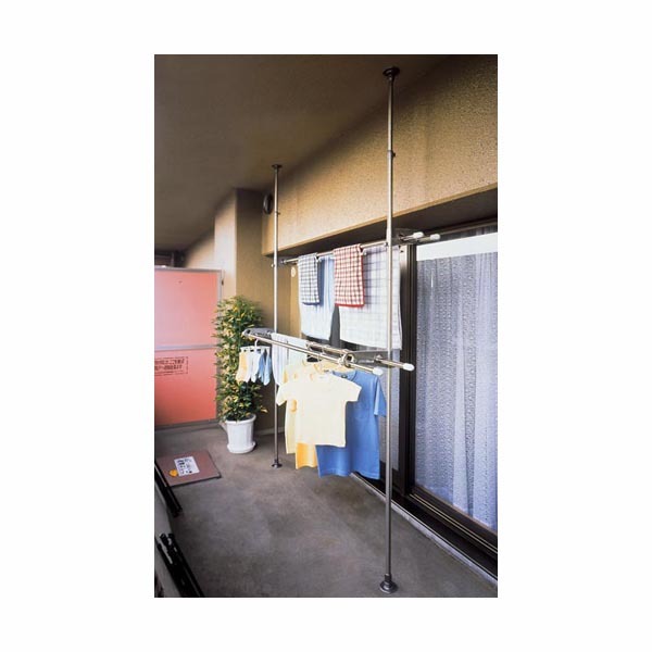 サビにくいステンレス製つっぱり式スタンドポール! ・ベランダ用つっぱり式2段ものほし竿受け(専用竿掛け S/L 各1セット付き) ・マンションのベランダでの洗濯物干しにも最適 ・サビに強いステンレス製 ・ネジ・クギ不要で簡単取り付け サイズ約:幅9×奥行51X高さ200~275cm 製品重量:約 2.8kg 色:ステン&グレー 素材 : 材質/本体 ステンレスパイプ、成型部品:PP樹脂・ABS樹脂、ゴム:天然ゴム、バネ・ネジ類:鉄(メッキ) 仕様(能力) 専用竿受けL:2個 専用竿受けS:2個 竿かけ数: 最大4本まで かけられる重さ: 全体で約20kgまで 注意事項 : ※物干し竿等は別売りとなります ※1.製品使用は改良のため予告なく変更することがあります ※2.製品の色調は、印刷のため多少実物と異なる場合があります。 ブランド : 積水樹脂 |