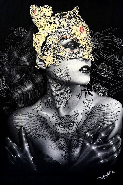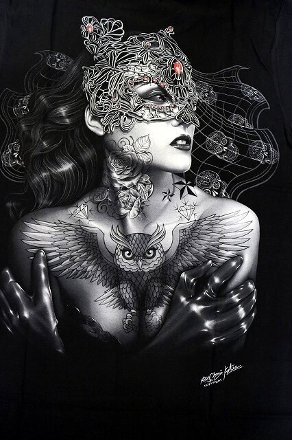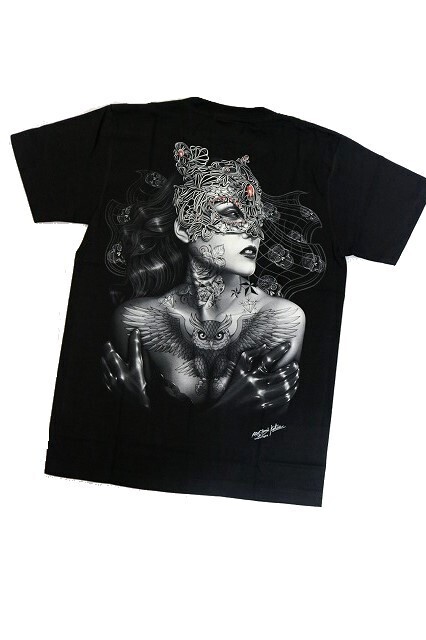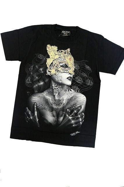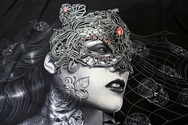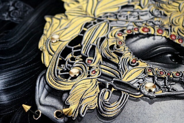 デザイン内の仮面の鼻の部分等に金属が使用されているとてもおしゃれで珍しいTシャツです。