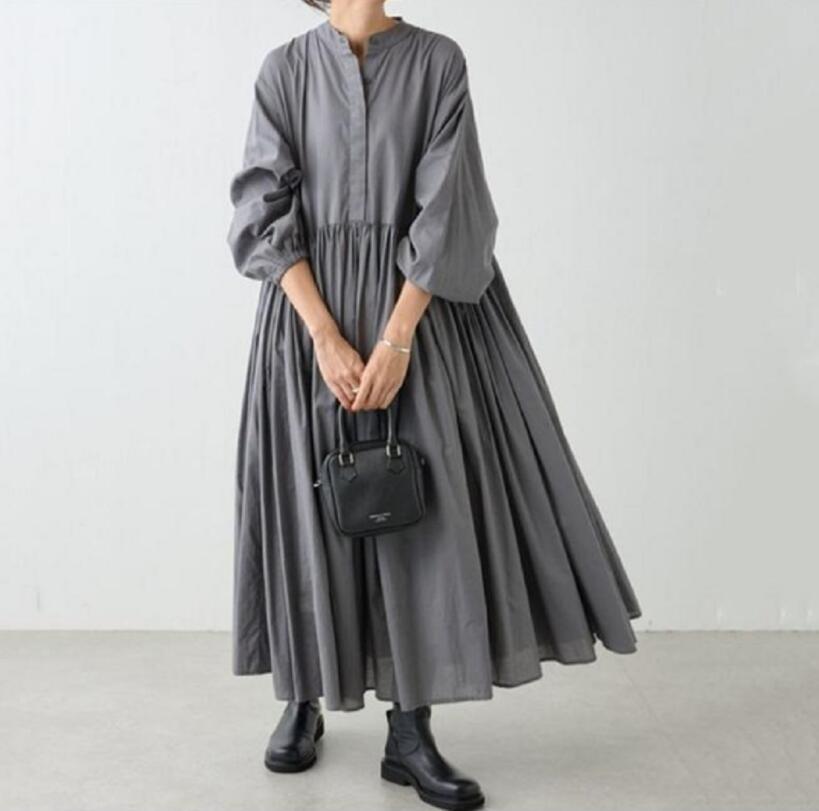 人気推薦 / 秋新作 上質 長袖 ワンピース ぷっくりお袖 シャツワンピース マキシ丈 大きいサイズ しっかり ロングワンピース / グレー