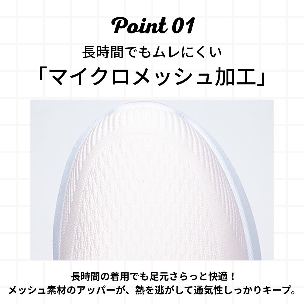 通気性とクッション性に優れたハニカム構造のカップインソールを使用し、足が疲れにくく蒸れにくいので、長時間歩いたり、立ちっぱなしでも快適です。