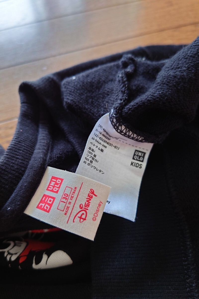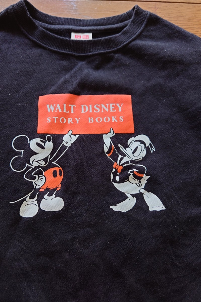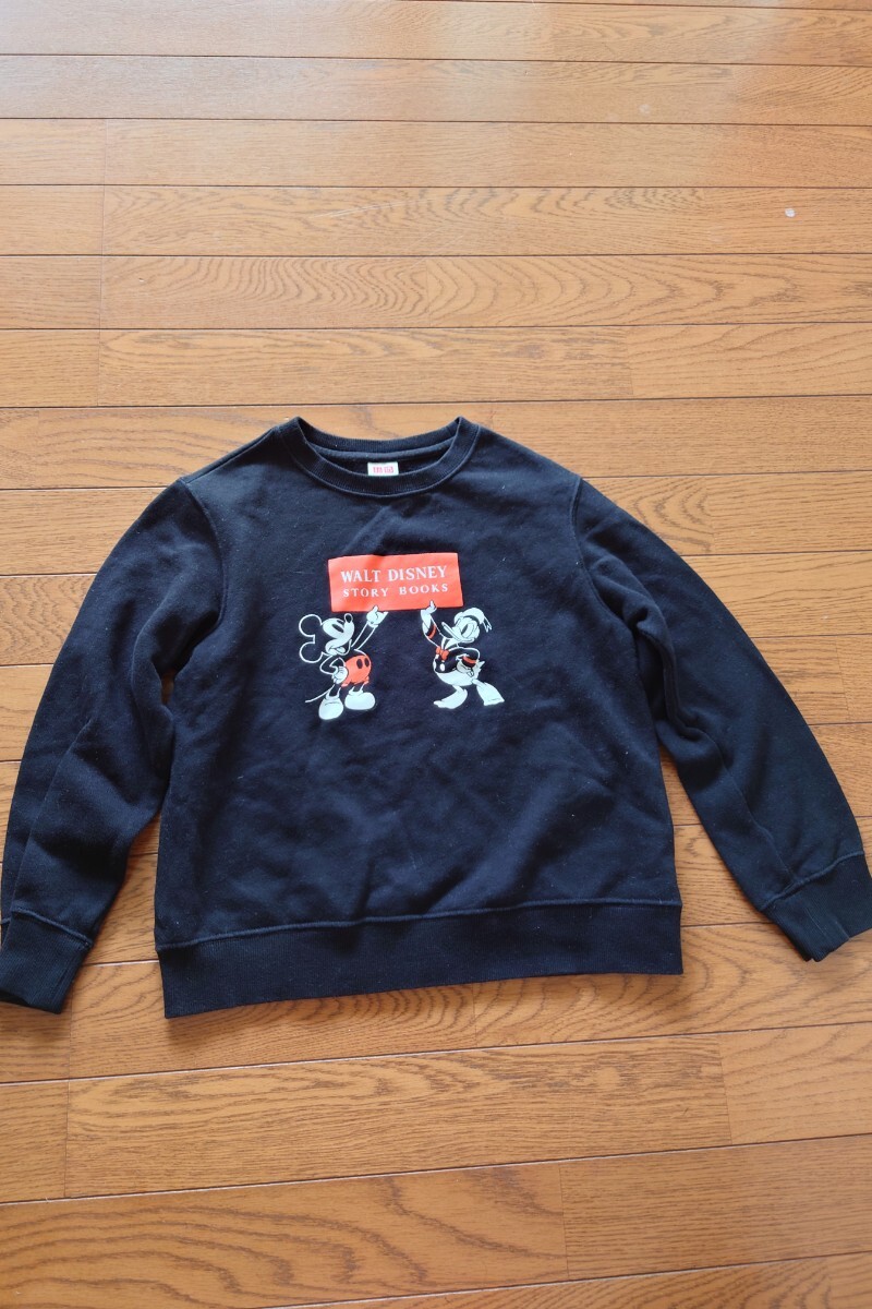 ミッキーとドナルドのプリントが特徴的な黒のトレーナー。