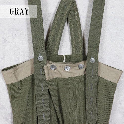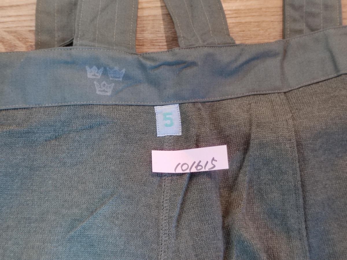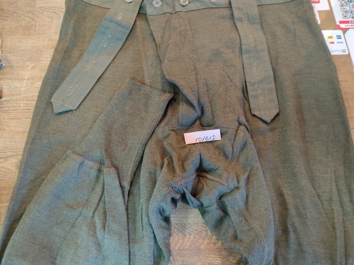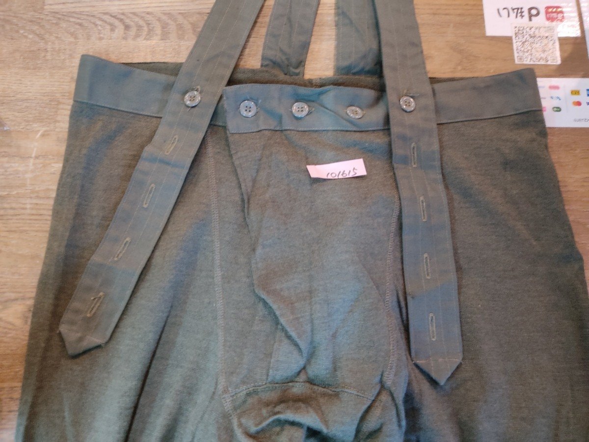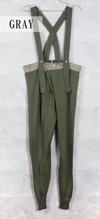スウェーデン軍にて採用されていたモーターサイクルアンダーパンツです。特徴はお尻が割れていることです。実用には勇気が必要ですが 脱がずに用を足せるようです! サスペンダーにボタンがついておりサイズ調整が90cmから70cmできます。ウエストも86cmから前後10cm調節可能。股下はリブ部分を除外で70cm、股上が深くて40cmほどあります。へそが隠れる寸法かと思われます。1.2.3.4枚目の写真は流用です(GRAYと表示してますがODです、ボタンなど個々に違いますので出品実物写真をご確認ください)。 ●素材:ウール ●状態:デッドストック 沖縄離島を除く全国500円でお送りいたします、落札価格にプラスでお願いいたします。