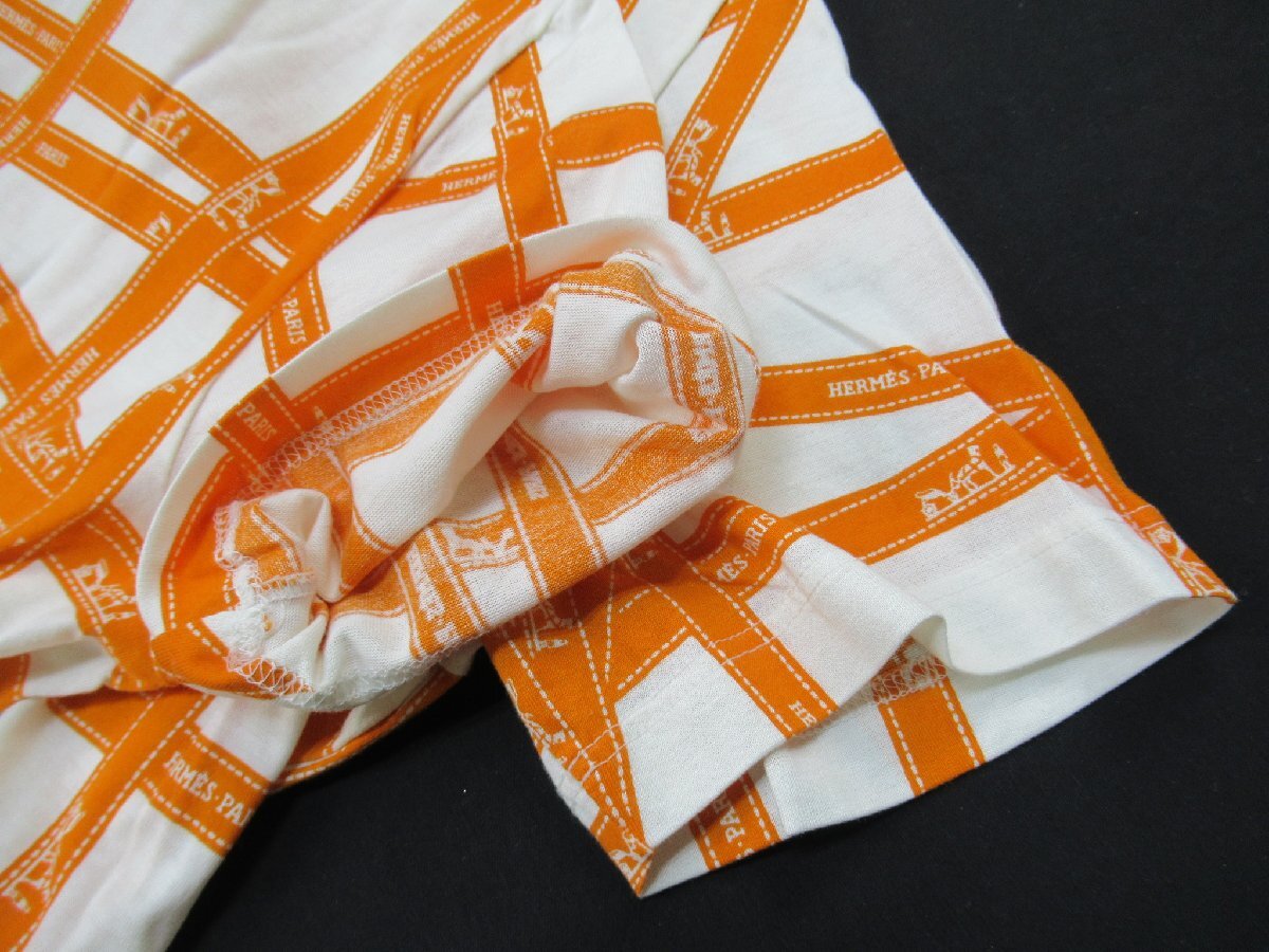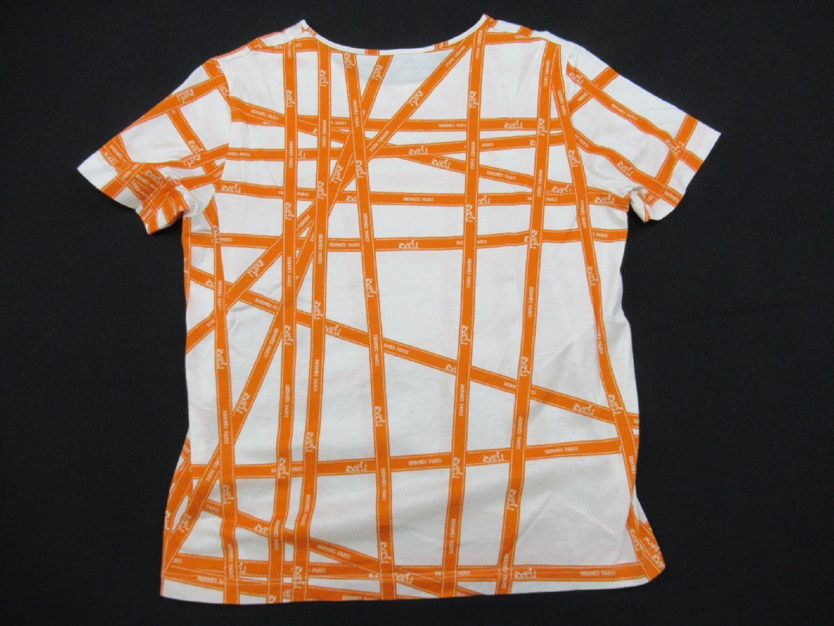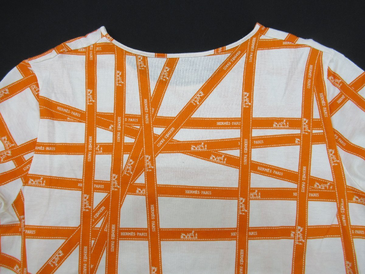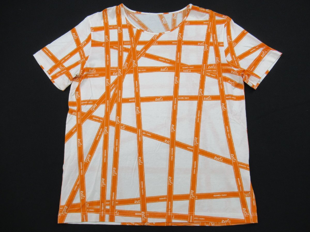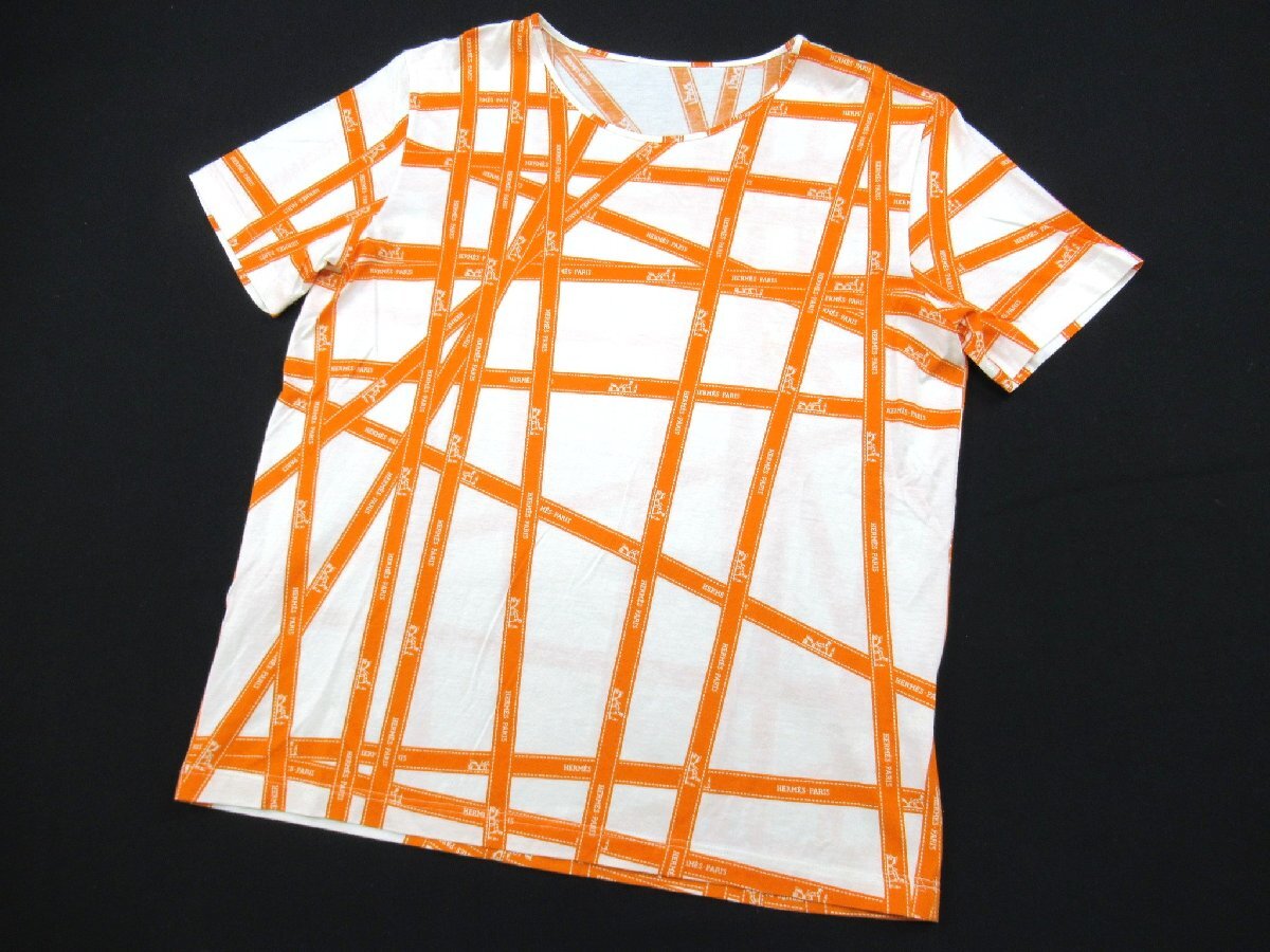 ★【B送900円】2369 HERMES エルメス ボルデュック ロゴリボン柄Tシャツ カットソー オレンジ×白 コットン100% 半袖 SM