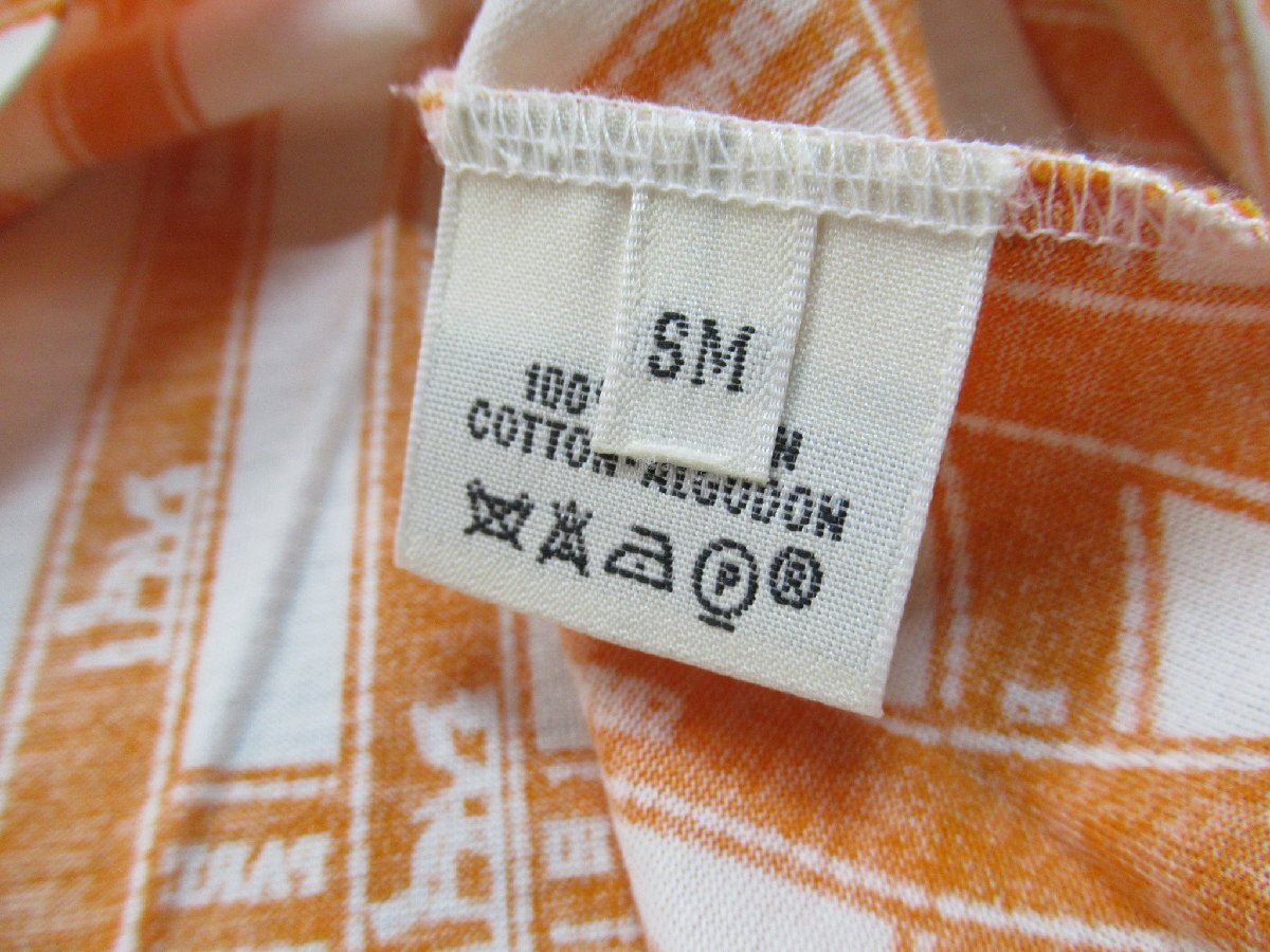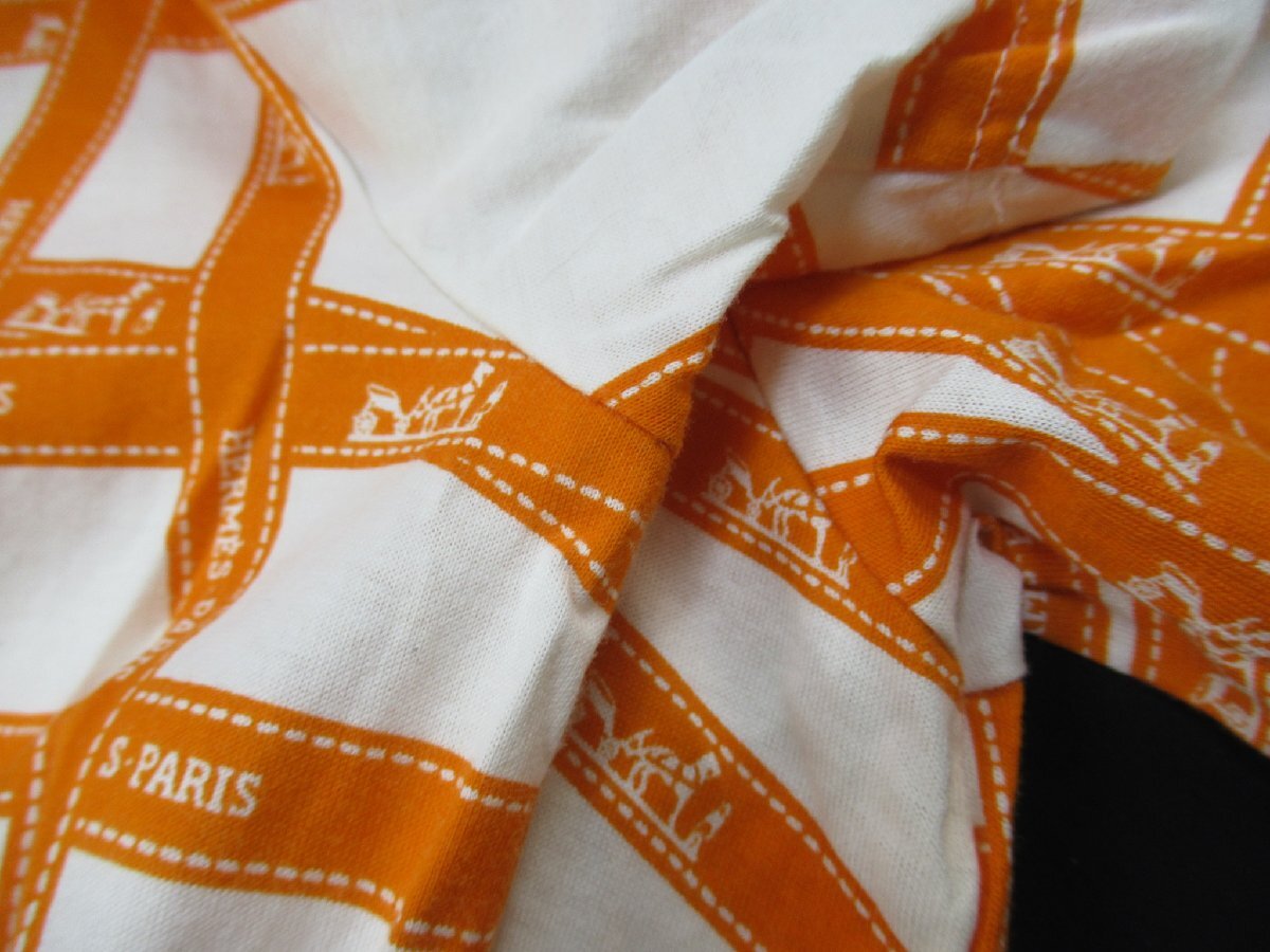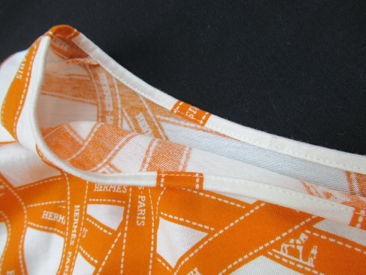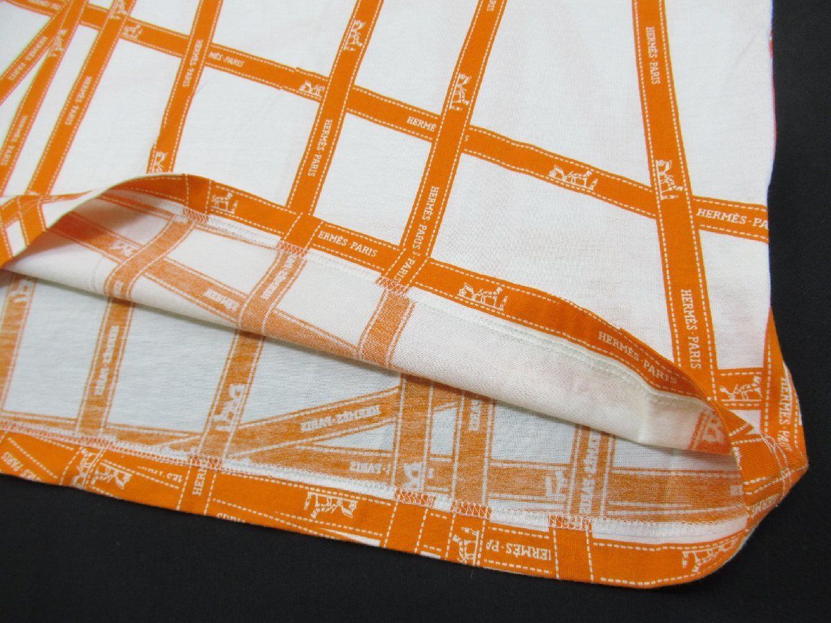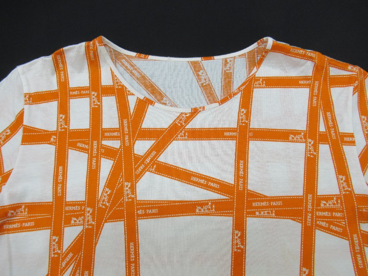 ★【B送900円】2369 HERMES エルメス ボルデュック ロゴリボン柄Tシャツ カットソー オレンジ×白 コットン100% 半袖 SM
