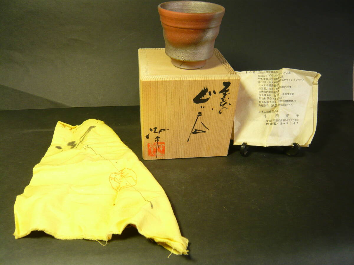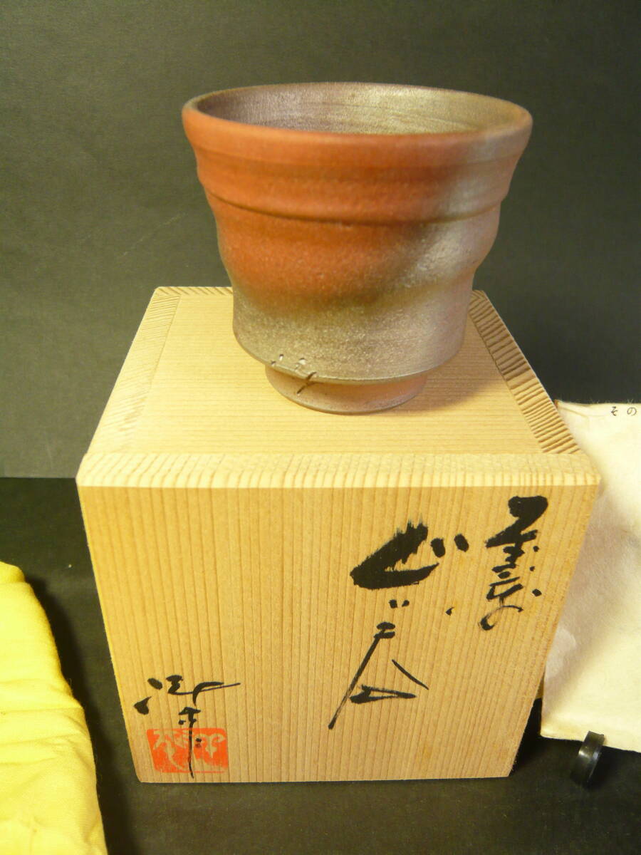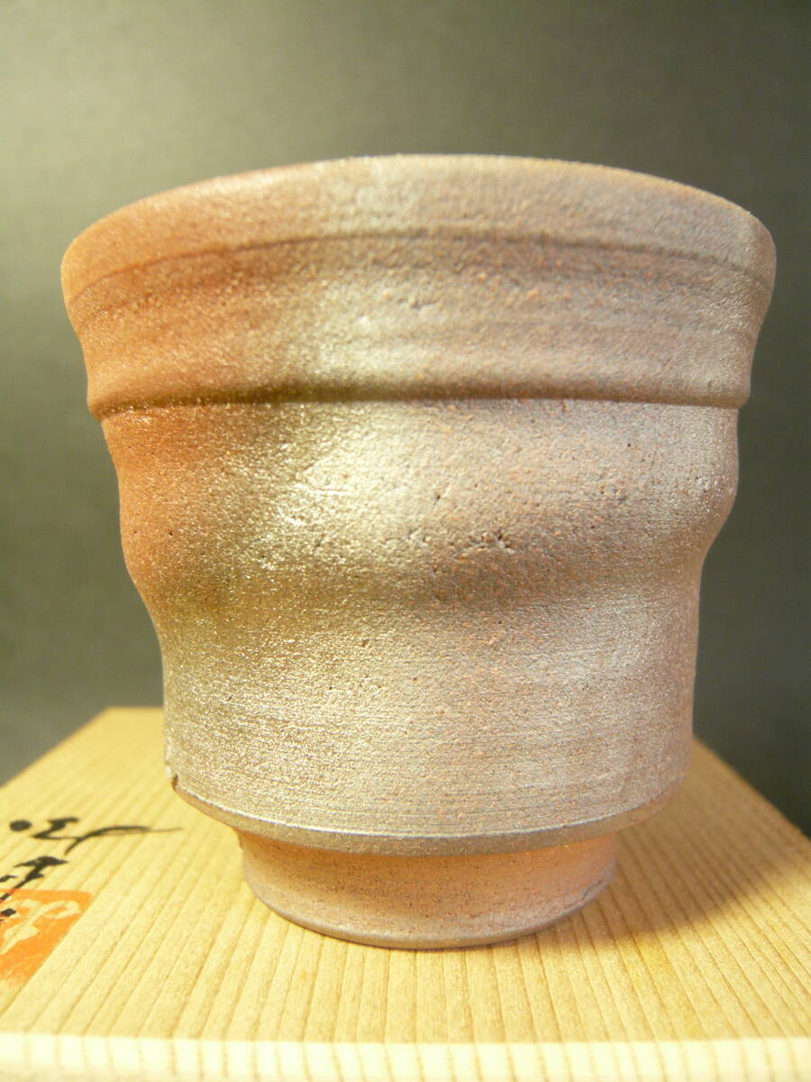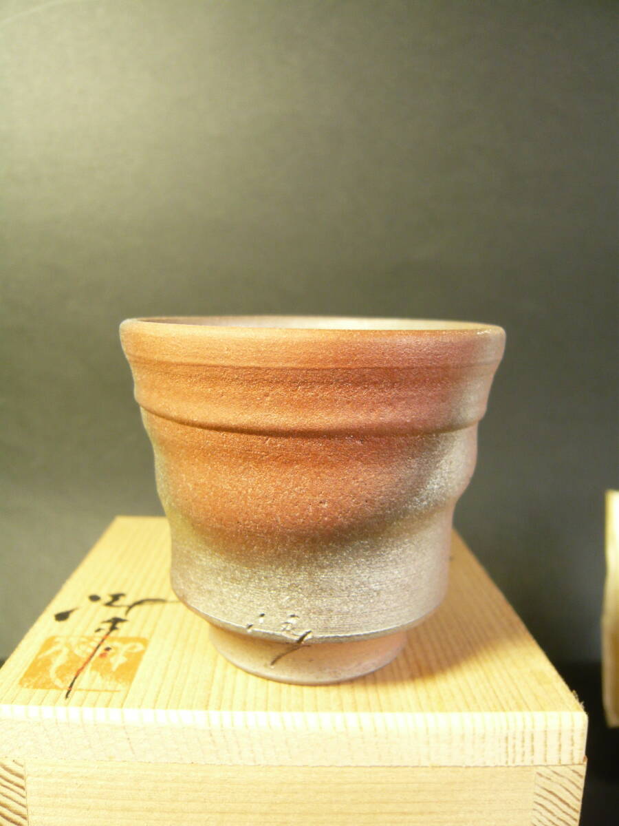 ぐいのみのサイズは、 高さ約5.5センチ、口径約6センチ、高台径約3センチ。共箱のサイズは、縦横高さ約9センチです。入手後は使っておりませんので、多分未使用品だと思います。無傷の完品ですが、箱に付いているはずの紐が抜けております。