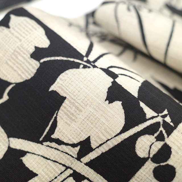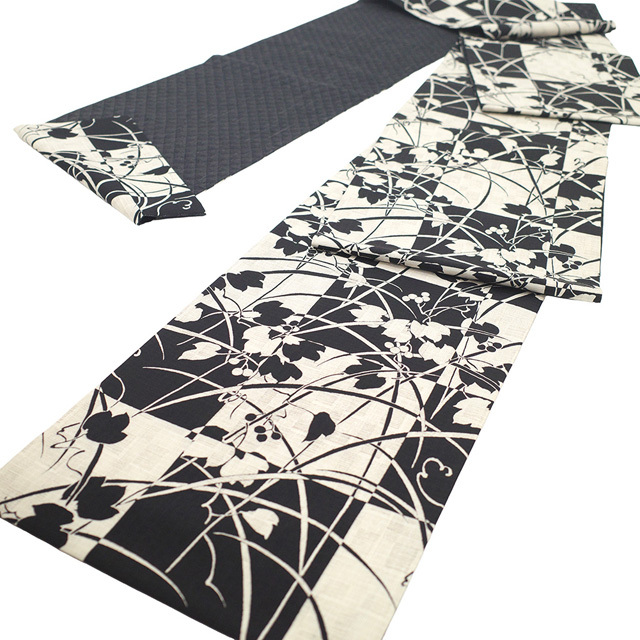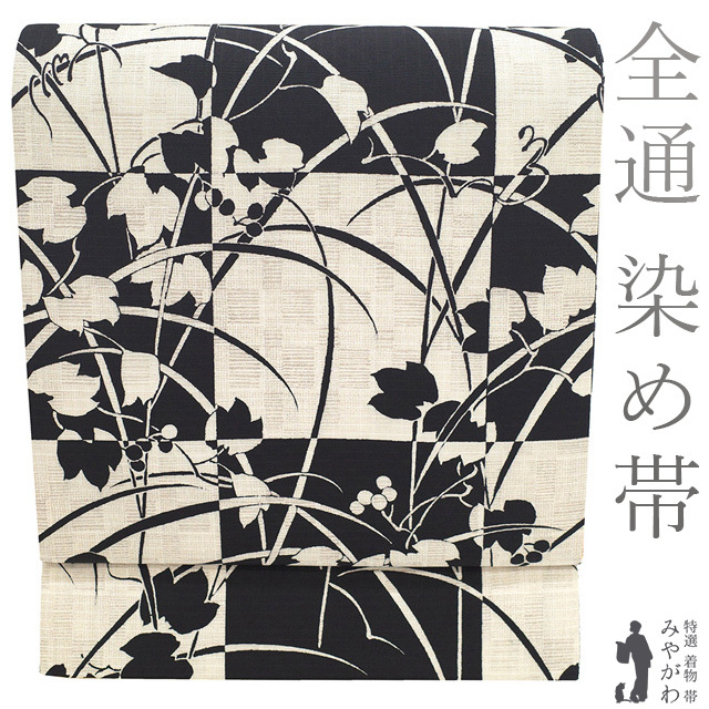袋帯 未使用 正絹 全通 染め帯 染帯 黒 薄ベージュ 葉 実 シルエット カジュアル 長尺 ロングサイズ 新古品 仕立て上がり みやがわ sb54414