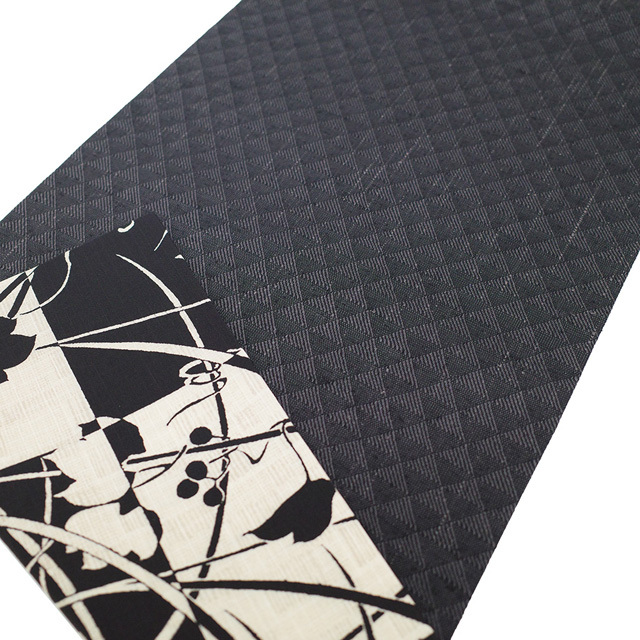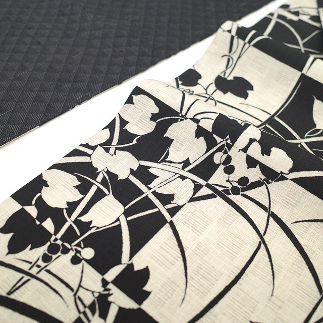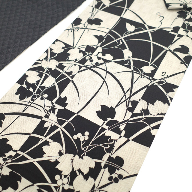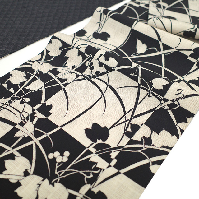 【新古品】 袋帯 未使用 正絹 全通 染め帯 染帯 黒 薄ベージュ 市松 葉 実 シルエット カジュアル 長尺 ロングサイズ 春 秋 冬 袋帯 モノトーン調 おしゃれ 仕立て上がり みやがわ sb54414
