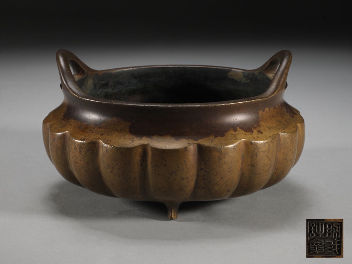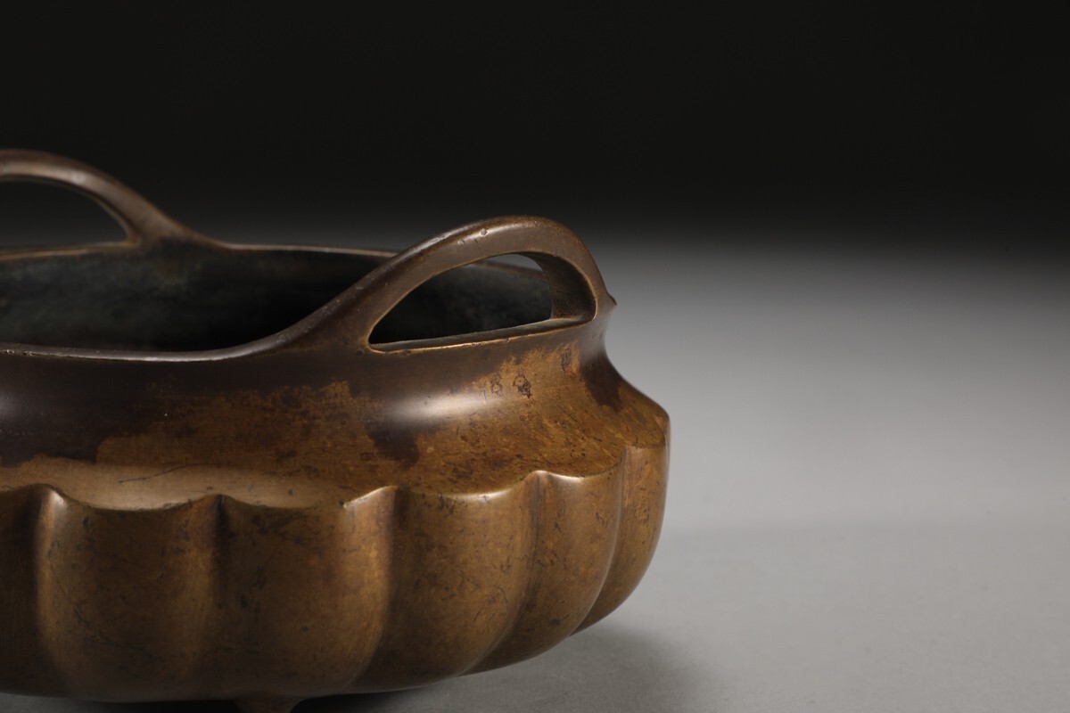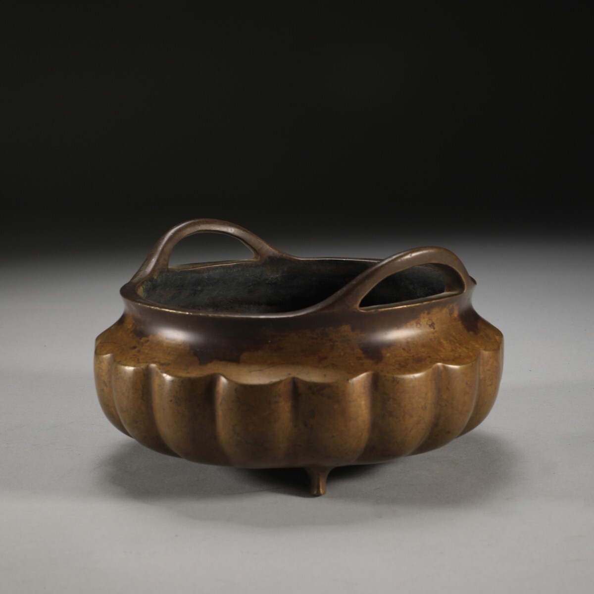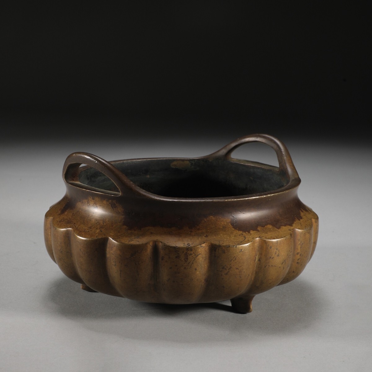 「明代 底款 古銅彫 瓜稜紋 橋耳老銅香炉」旧銅器 置物擺件 賞物 中国古美術 旧蔵出